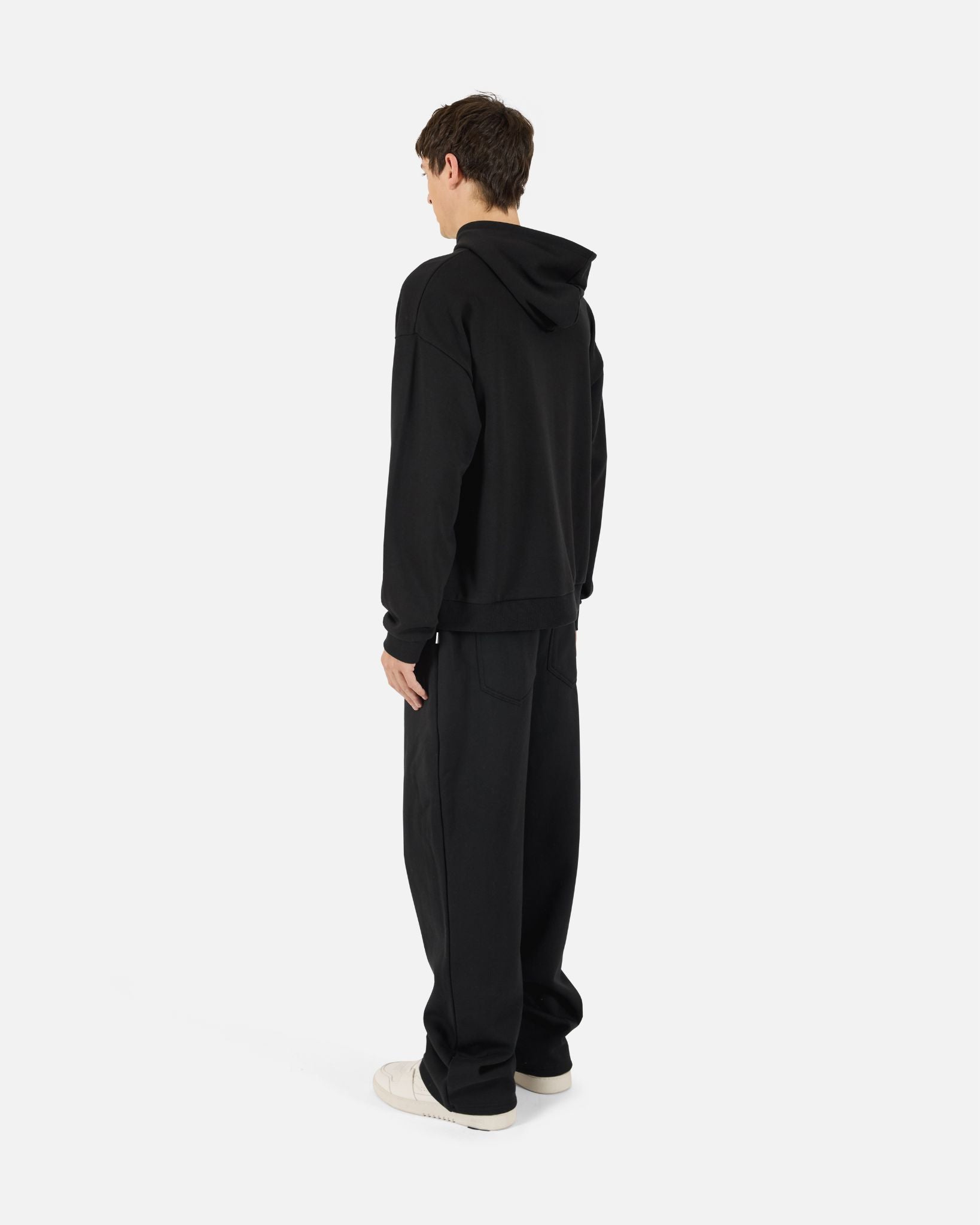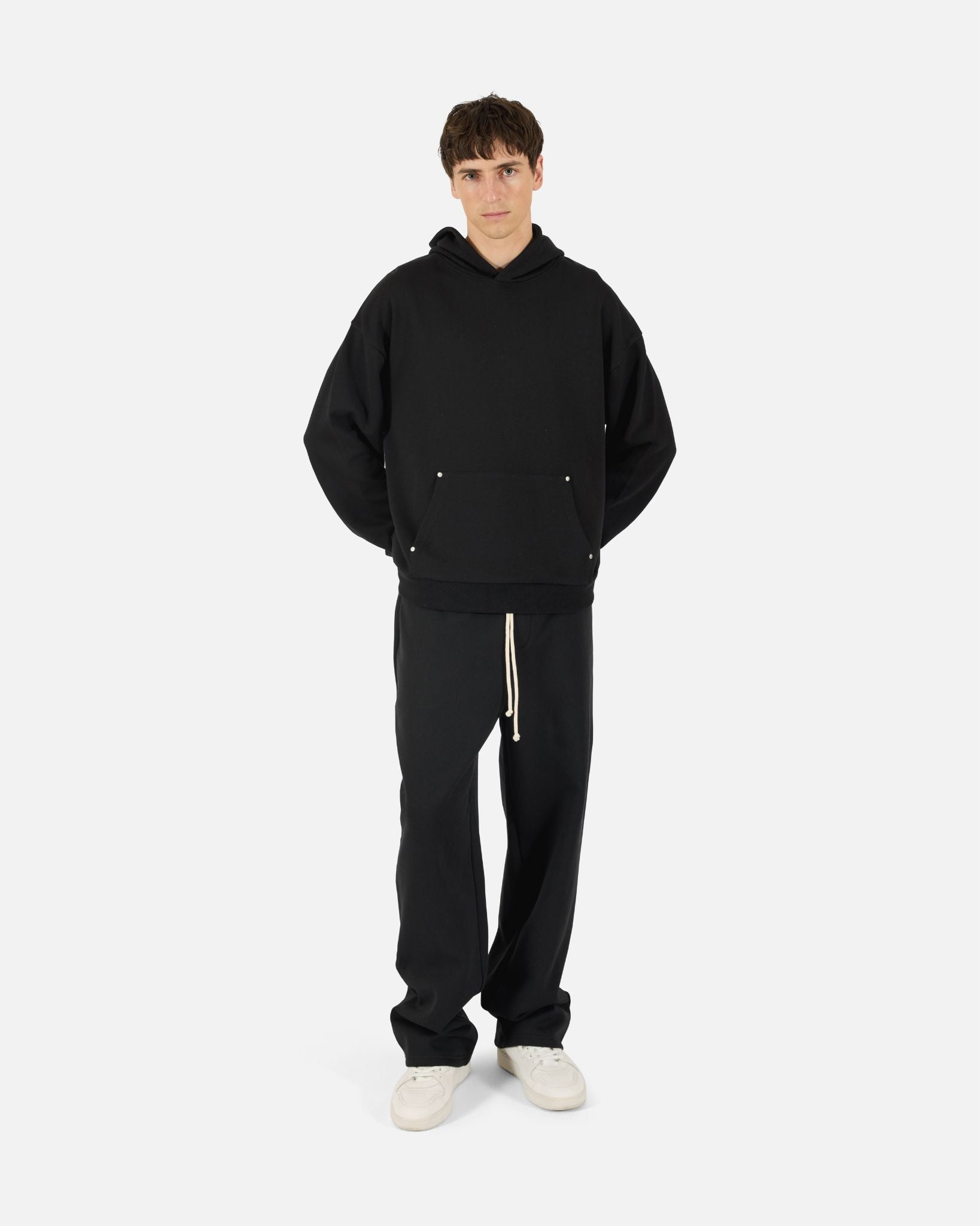 A relaxed pullover hoodie crafted from soft terry fabric. Designed with dropped shoulders and a regular fit, it features a classic kangaroo pocket accented with matte silver rivets, ribbed cuffs and hem, and an easy, everyday feel that balances comfort with subtle detail.