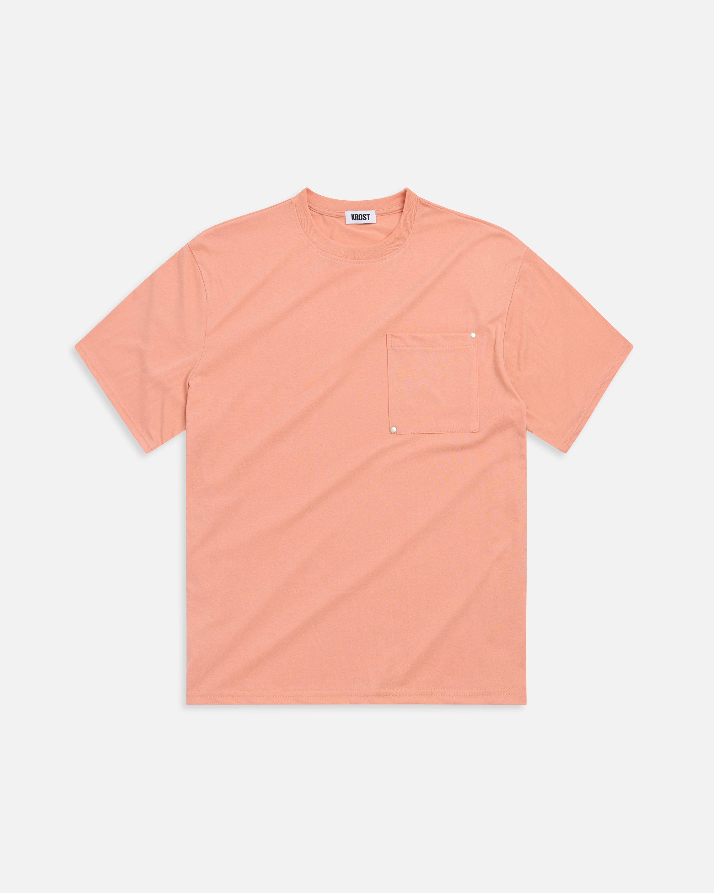 Soft, mid-weight cotton t-shirt designed with a relaxed fit. Features a ribbed crew neckline, straight hem, and a chest patch pocket finished with matte silver rivets for a subtle utilitarian detail.
