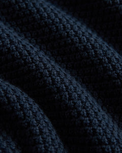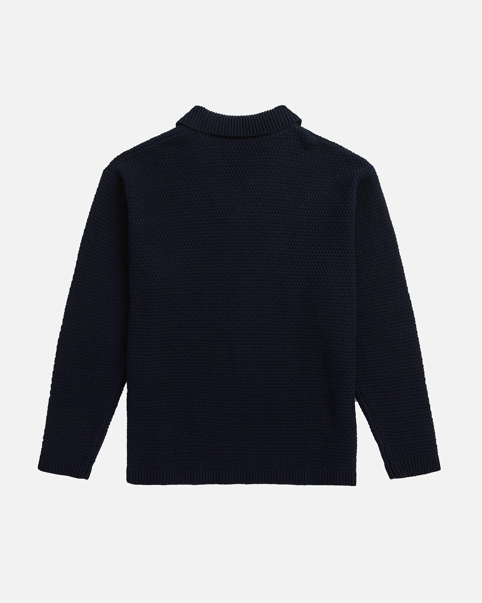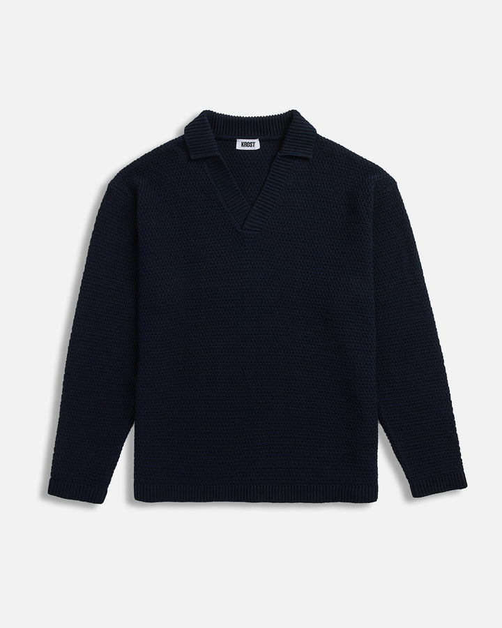 The Broken Rib Long Sleeve Polo in Dark Navy is a refined knit with subtle texture and everyday ease. Crafted from 100% cotton, it features a broken rib-knit pattern that forms a soft grid effect, an open collar with wide placket, and ribbed cuffs. Designed with a relaxed fit and straight hem, it’s a modern update to a classic silhouette.