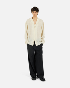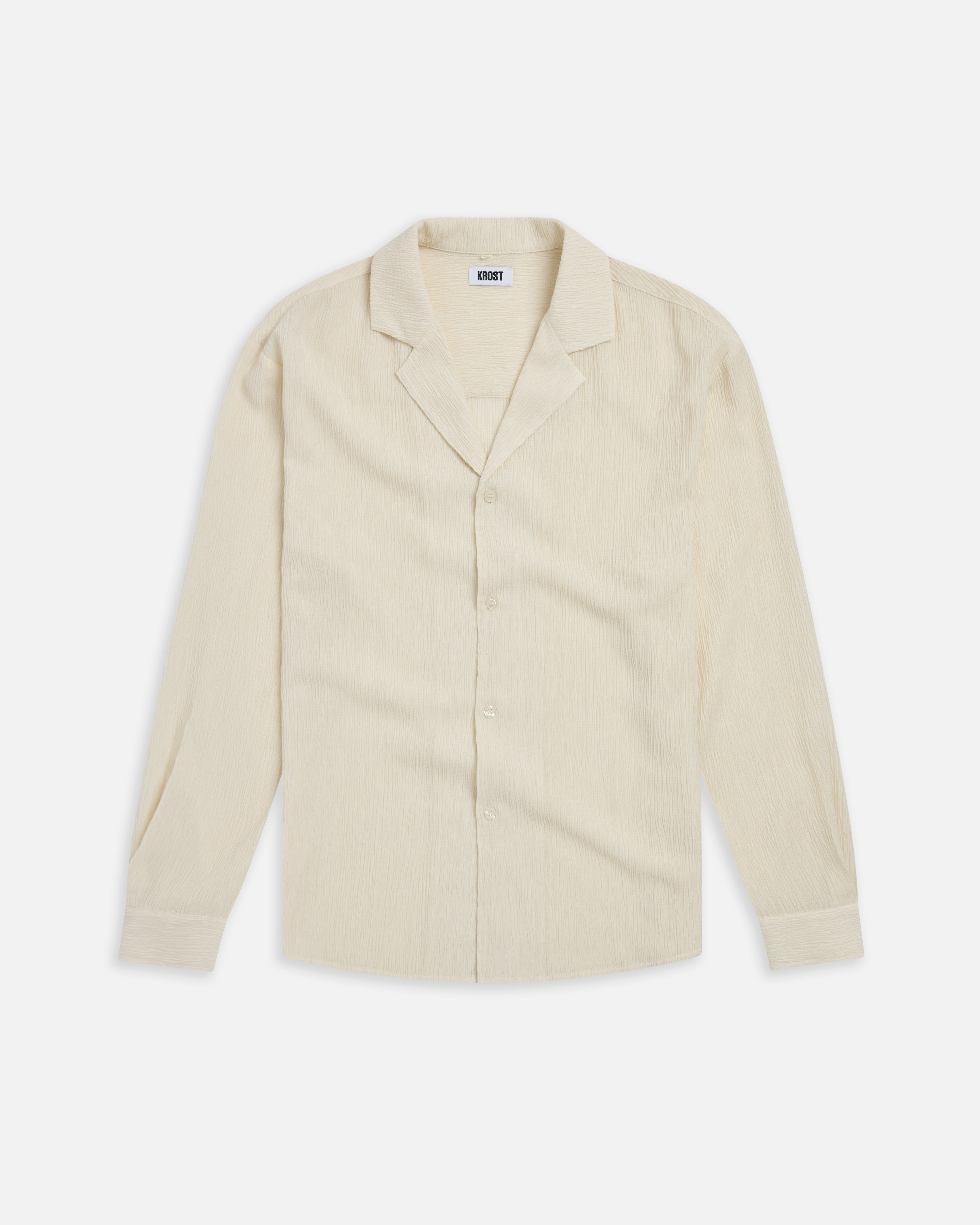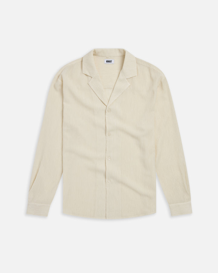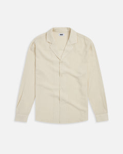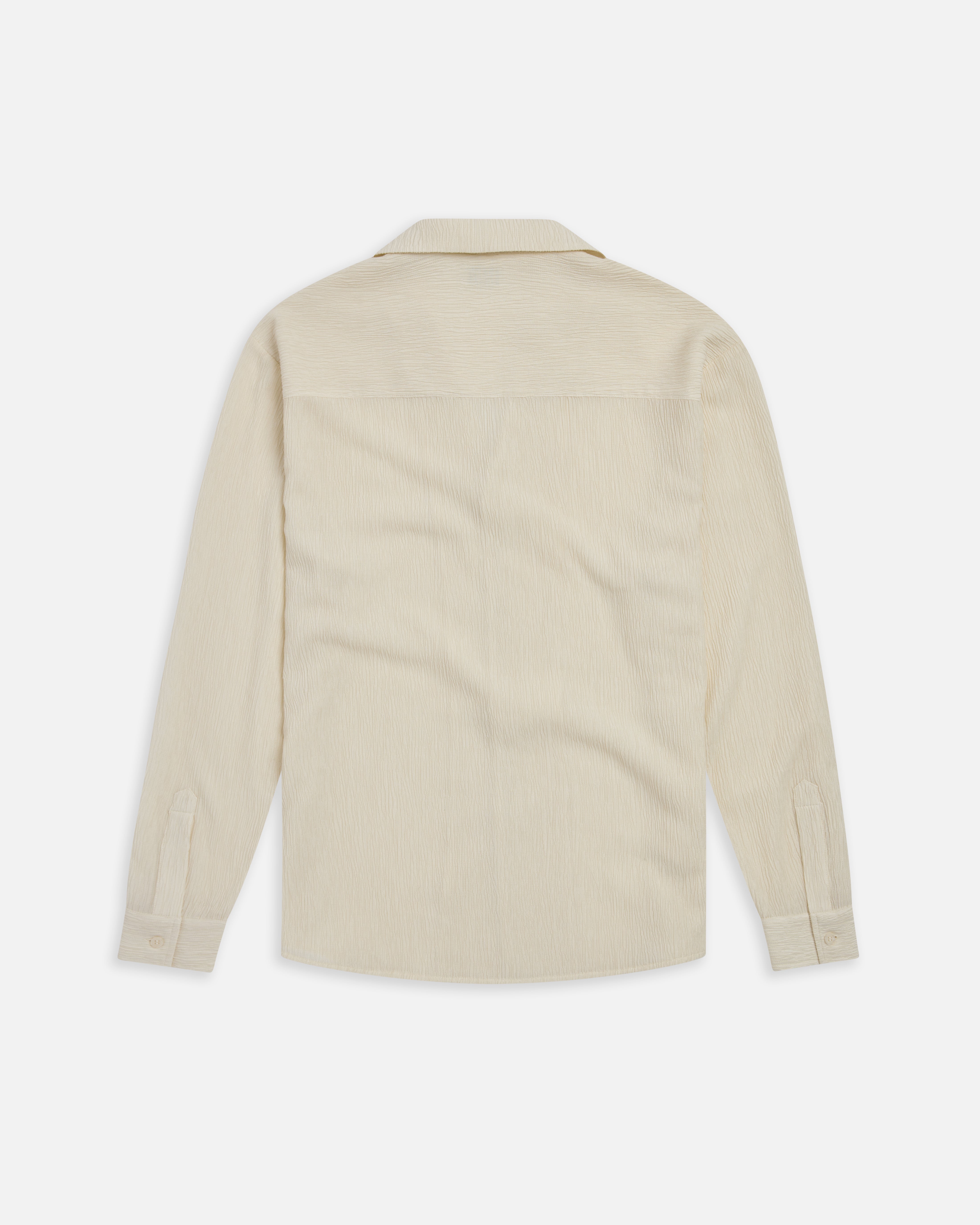 Ripple-textured camp shirt designed with a relaxed collar, buttoned cuffs, curved hem, and a soft drape for warm-weather layering.