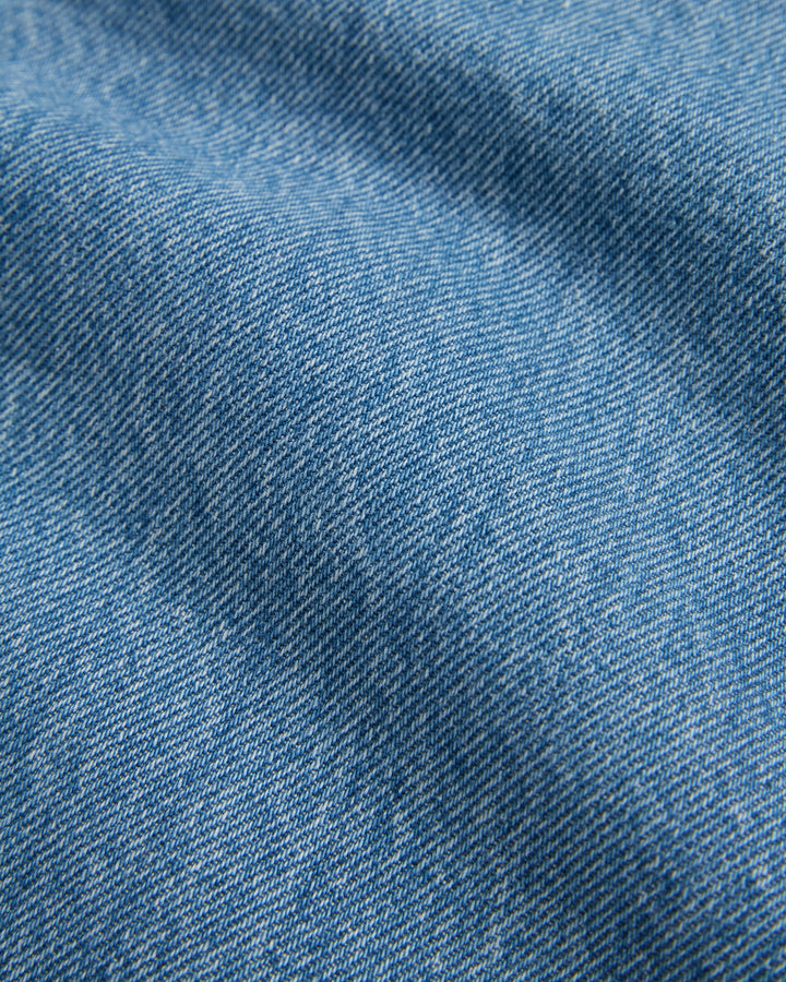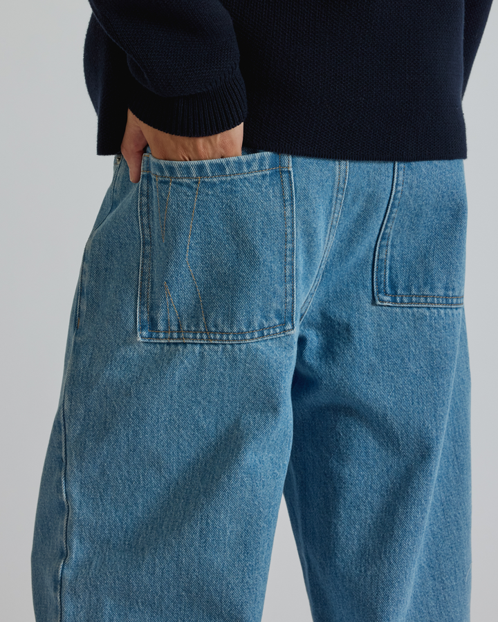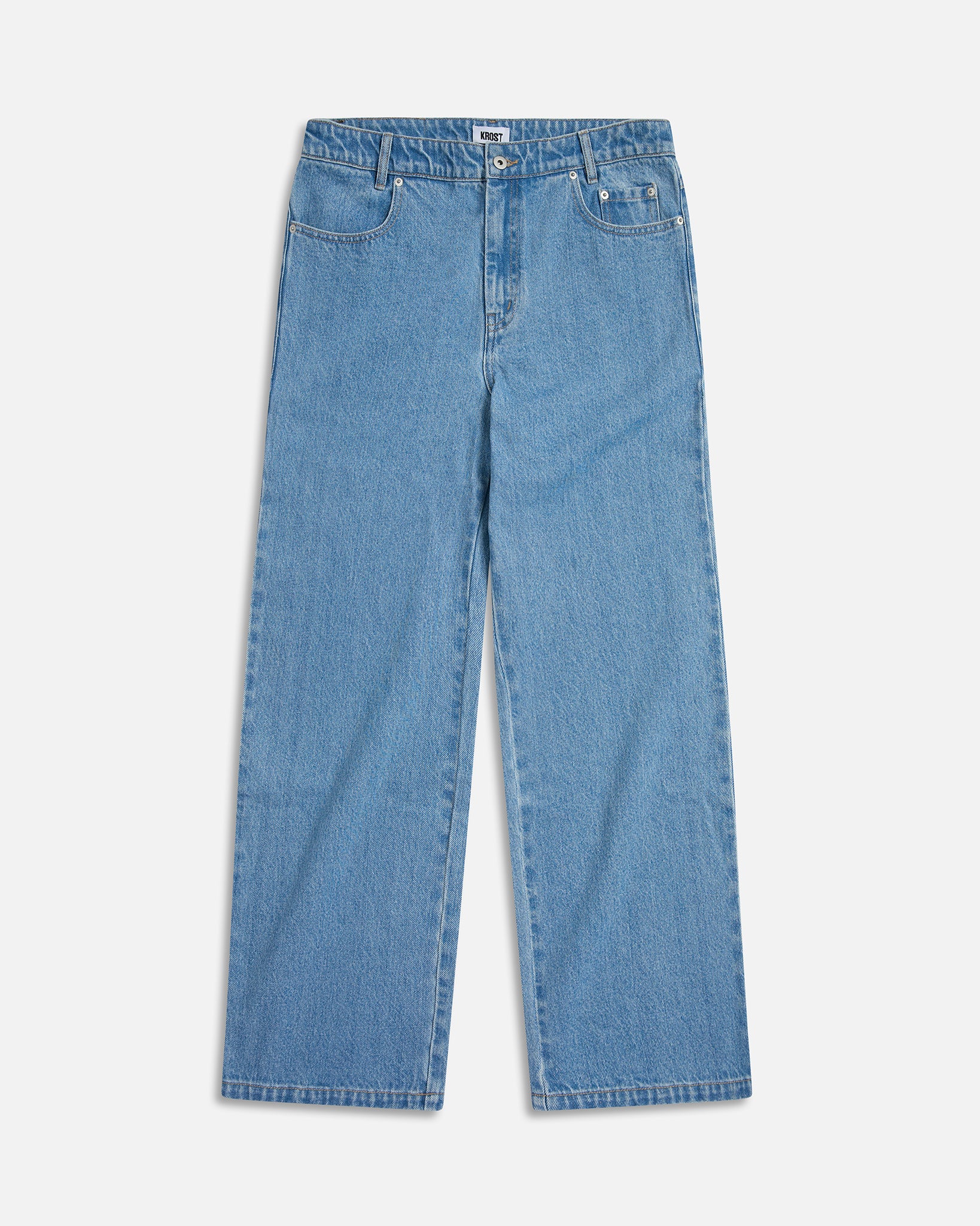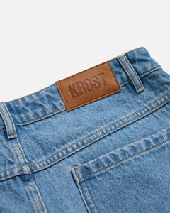 A modern staple with a relaxed edge, the Crosby Denim Jean in light blue is crafted from 13.4 oz cotton denim and cut in a mid-rise, wide-leg silhouette. Detailed with classic five-pocket styling, and a signature KROST logo patch at the back waistband.