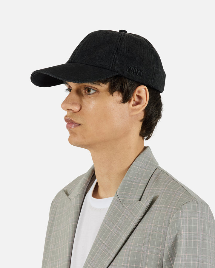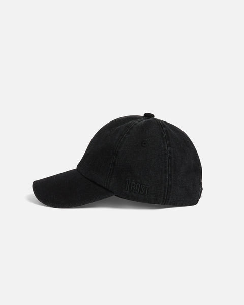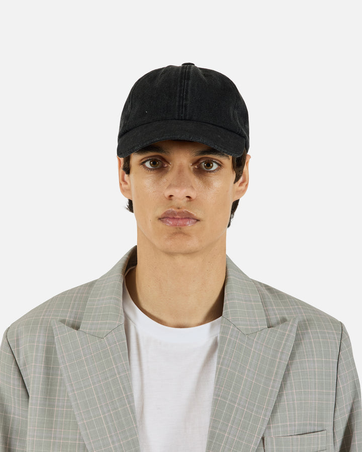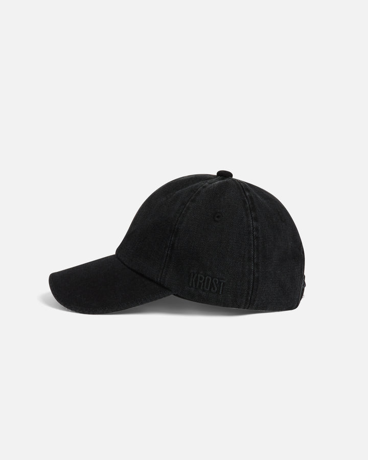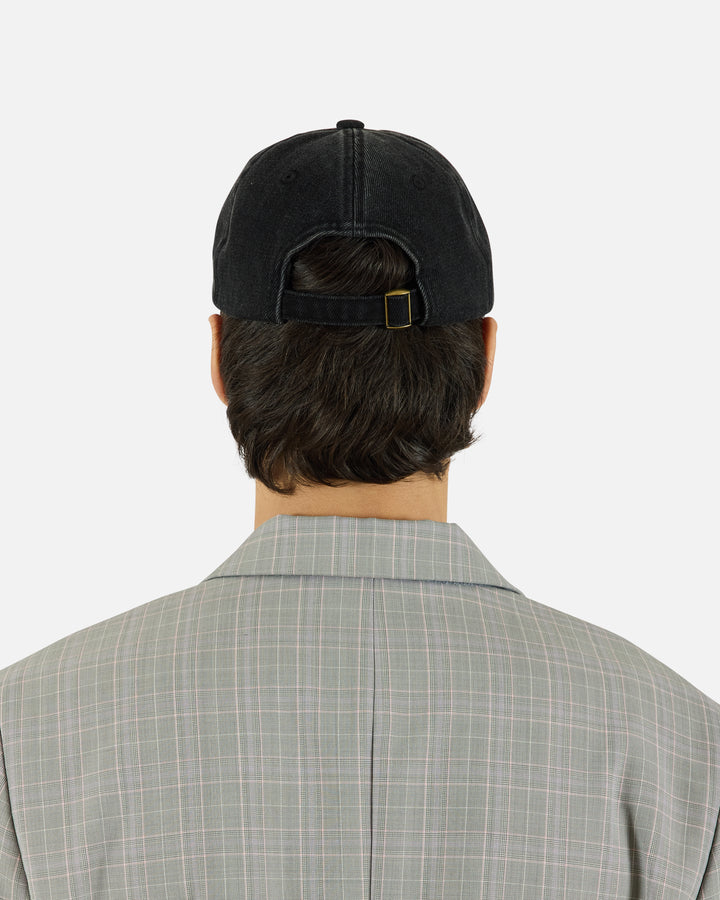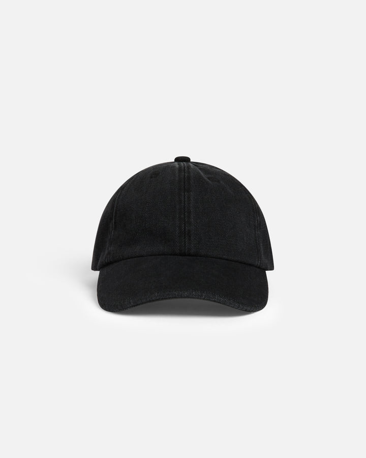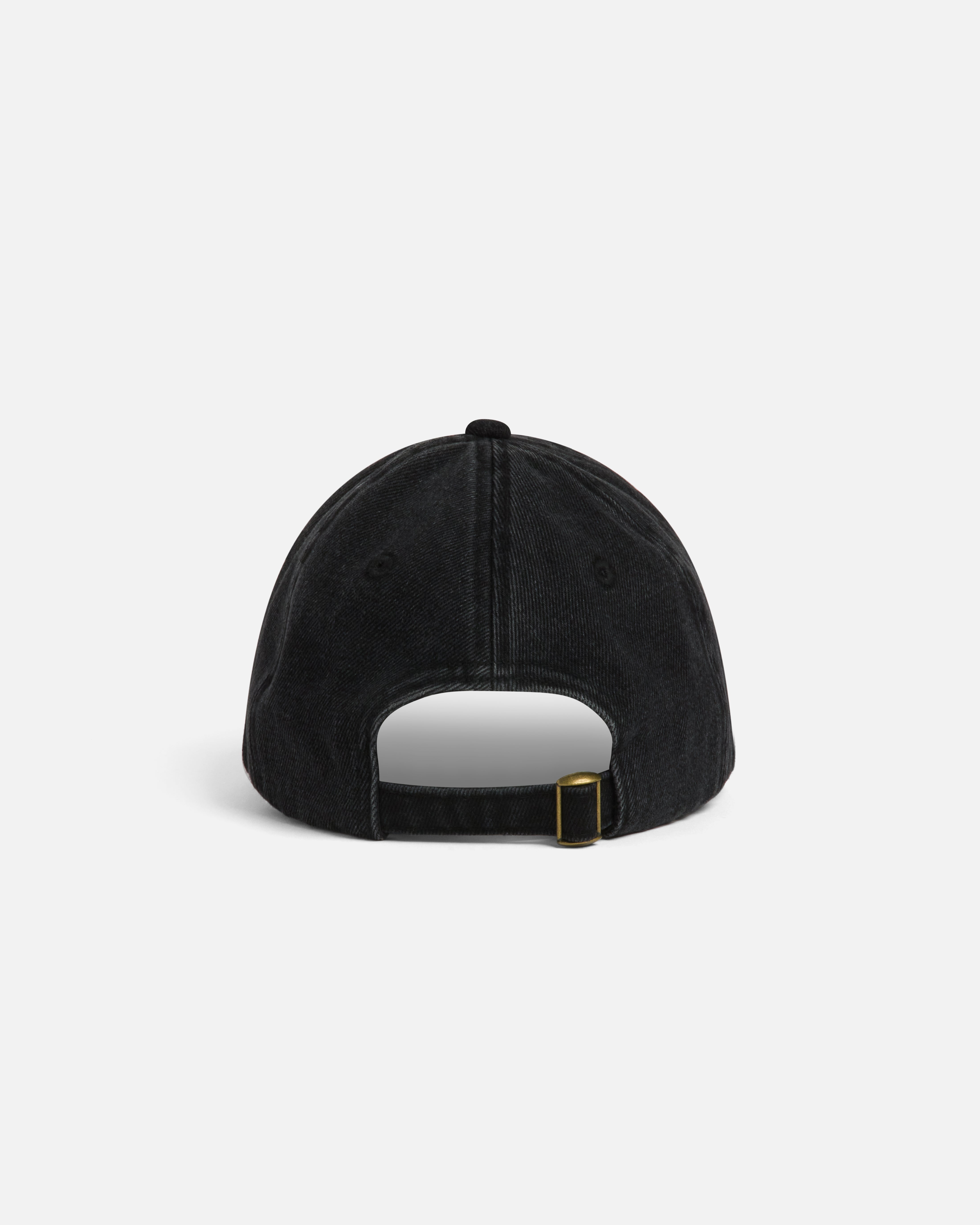 Six-panel cotton denim cap in dark wash, features blanket stitch detailing along the brim, embroidered eyelets, adjustable strap, and tonal logo embroidery at the side.
