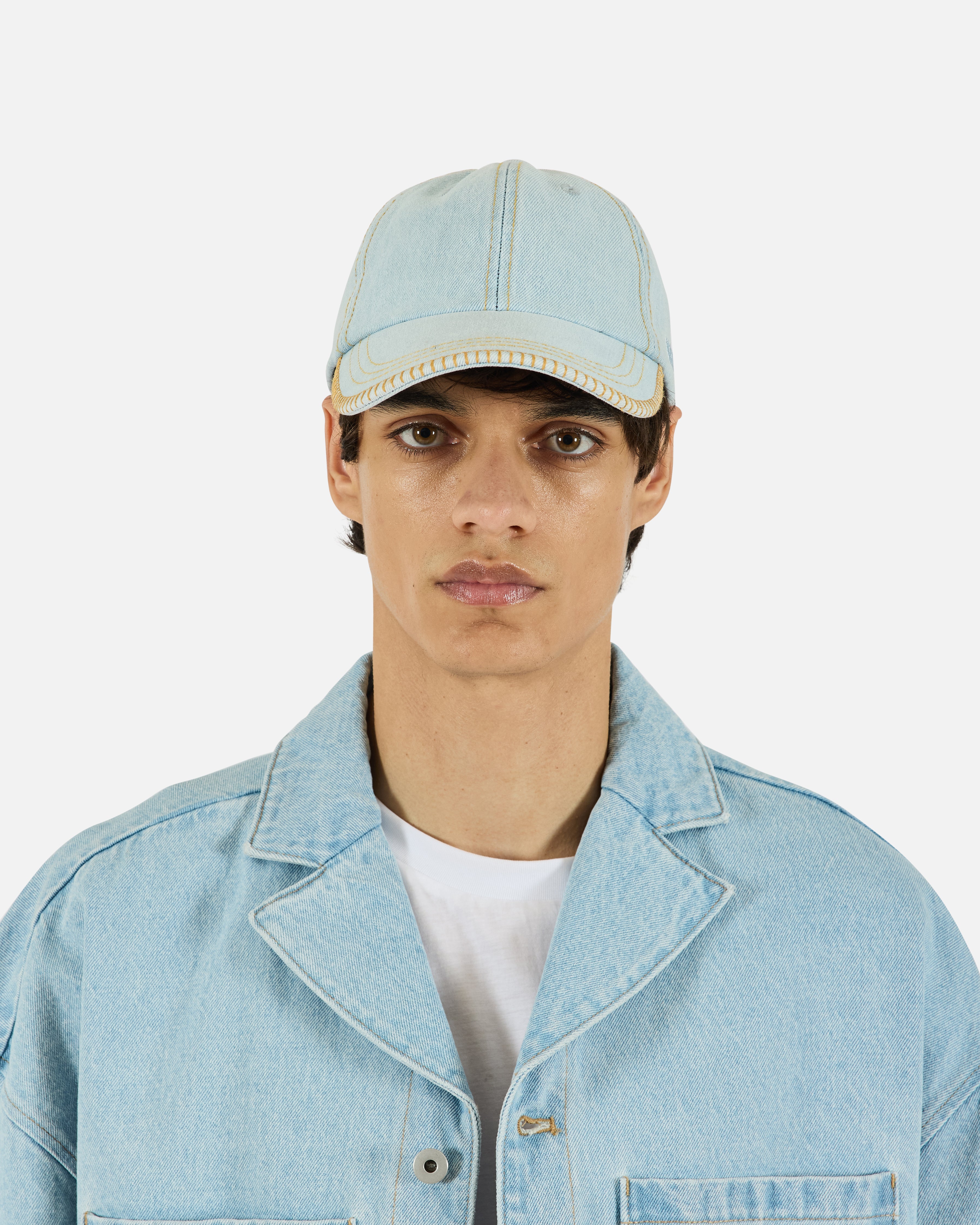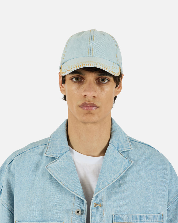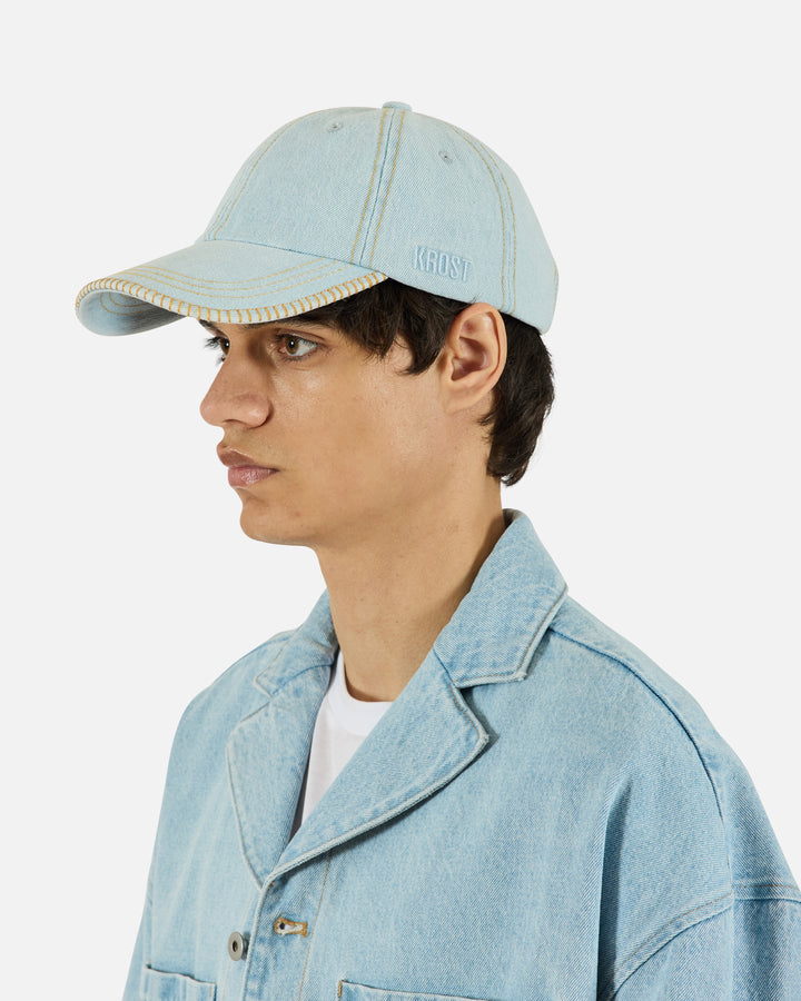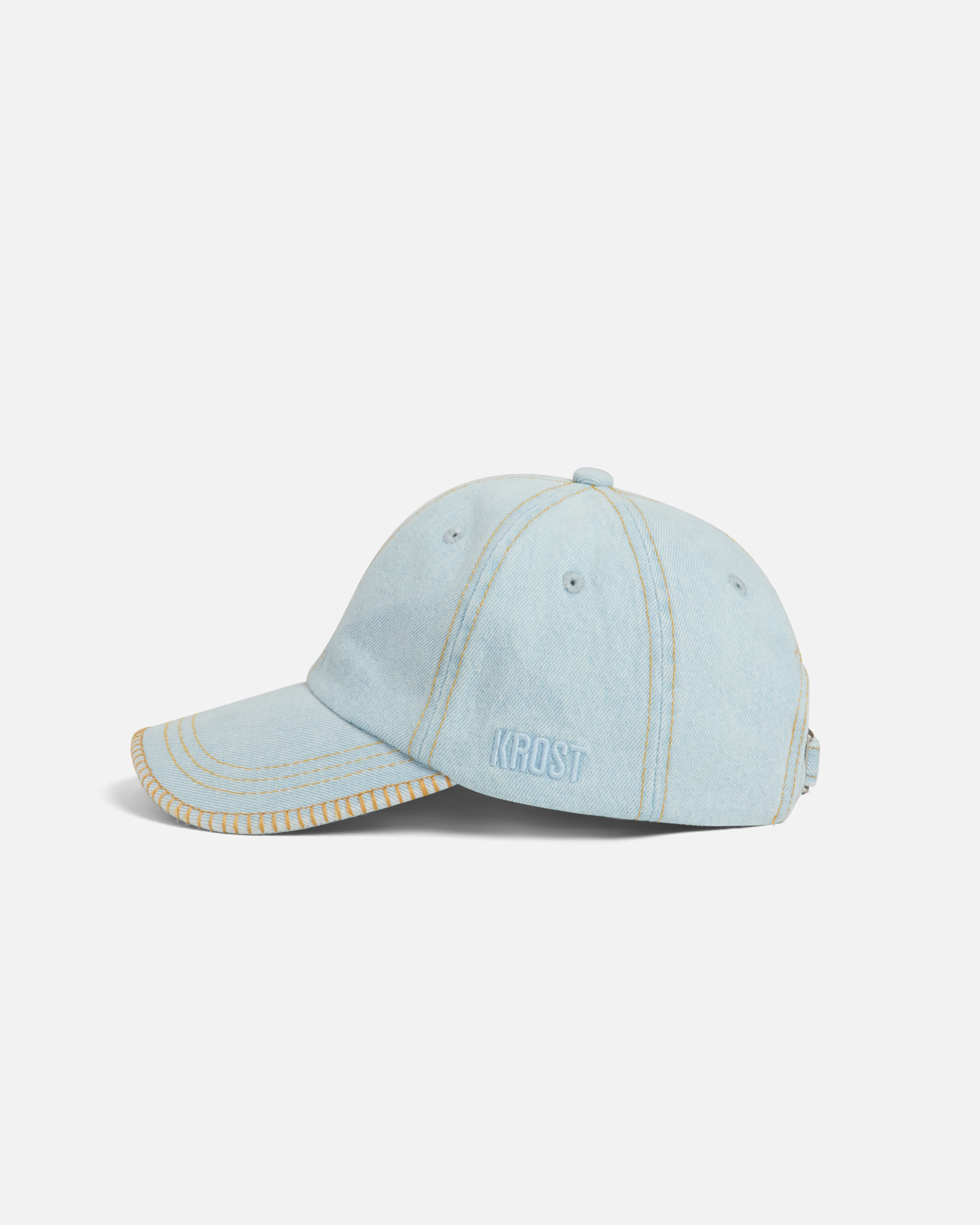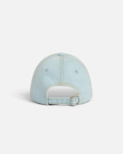 Six-panel cotton denim cap in light wash, features blanket stitch detailing along the brim, embroidered eyelets, adjustable strap, and tonal logo embroidery at the side.