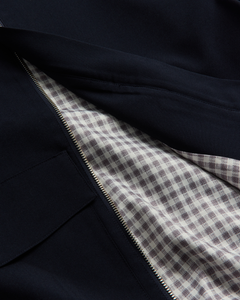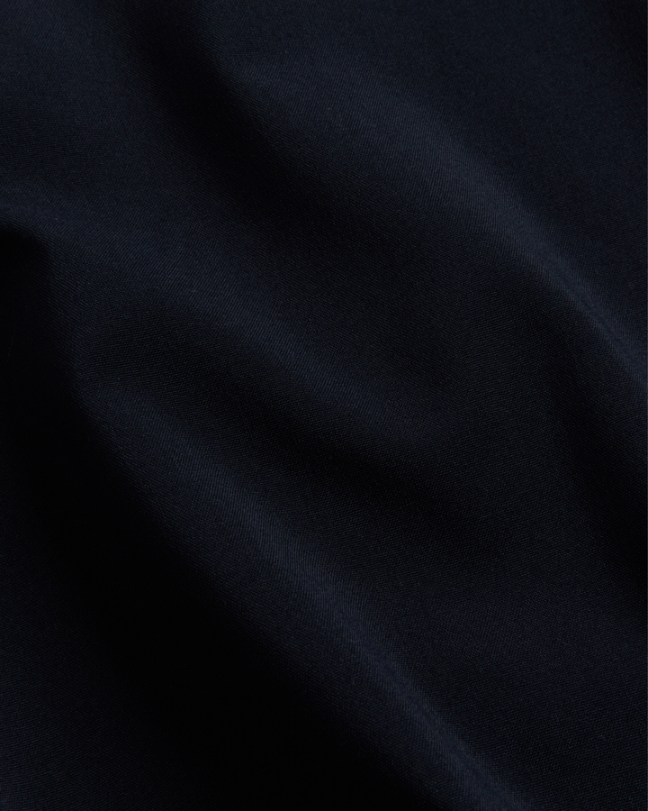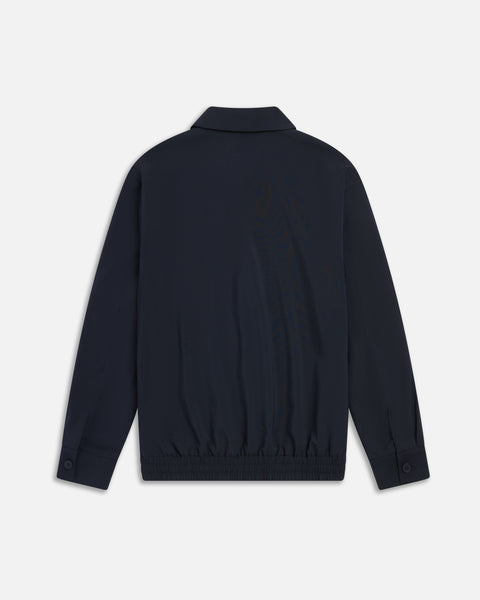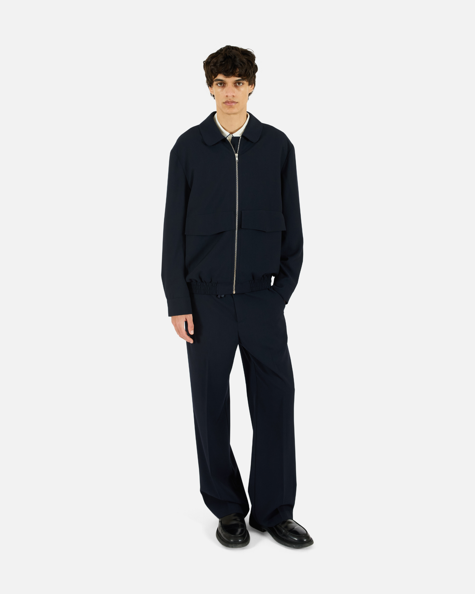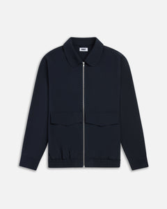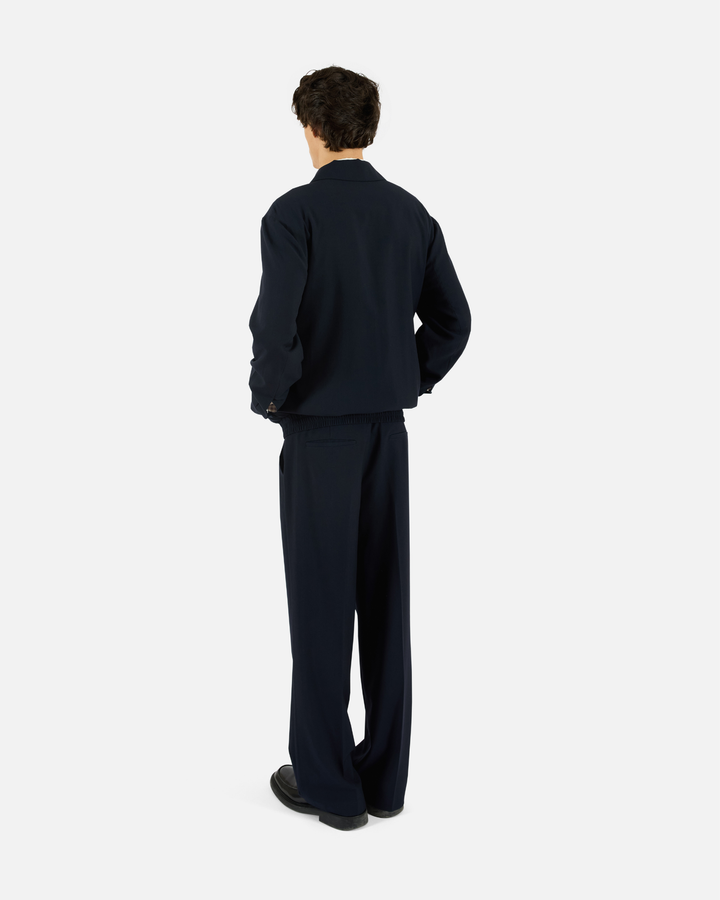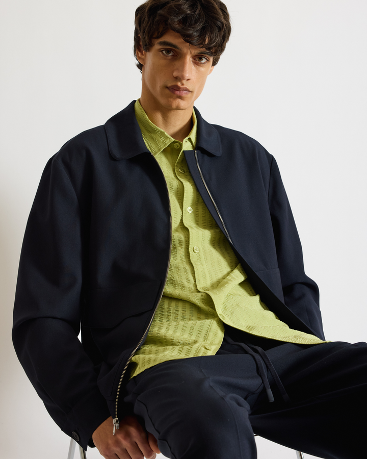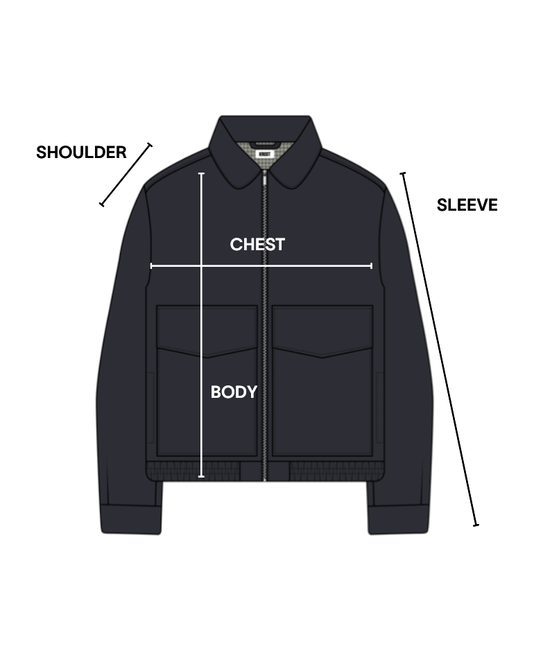 Relaxed silhouette cut from a smooth recycled-poly blend with subtle structure. Designed with a full front zip, oversized flap pockets, functional welt pockets, and an elastic waistband for ease. Contrast lining and button cuffs finish the piece with thoughtful detail.