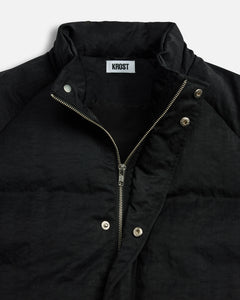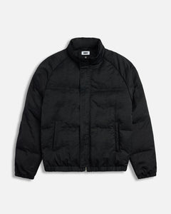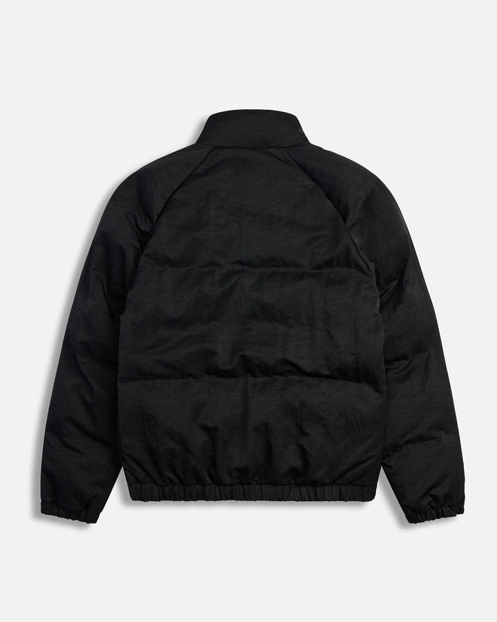 The Eco Nylon Puffer in Black is designed for warmth without the weight. Crafted from 100% recycled nylon, the jacket features a funnel neck collar, concealed front zip with snap closure, and quilted panel construction with insulation. Finished with raglan sleeves, elastic cuffs and hem, and side welt zip pockets for everyday practicality.