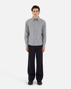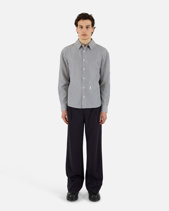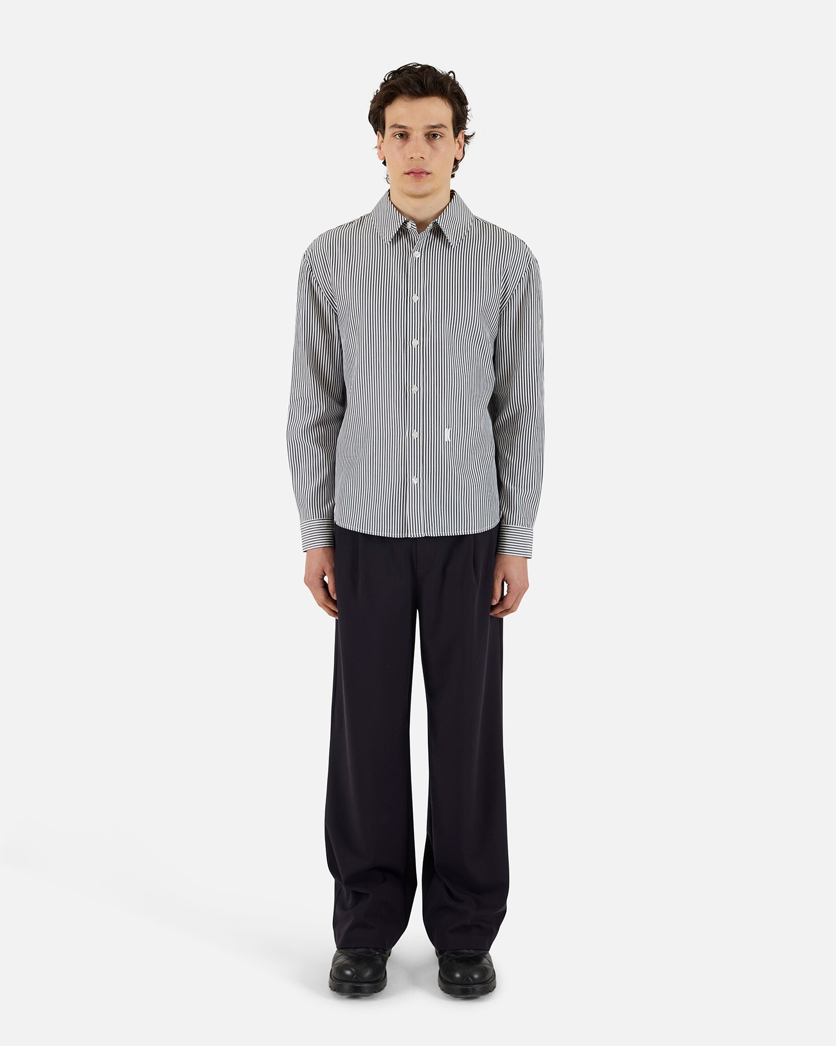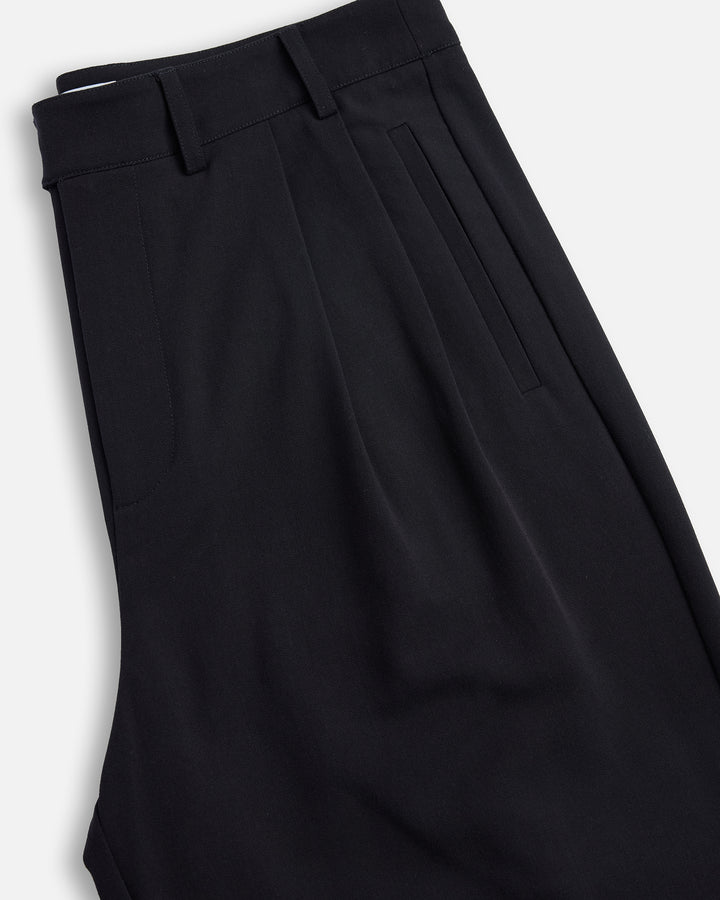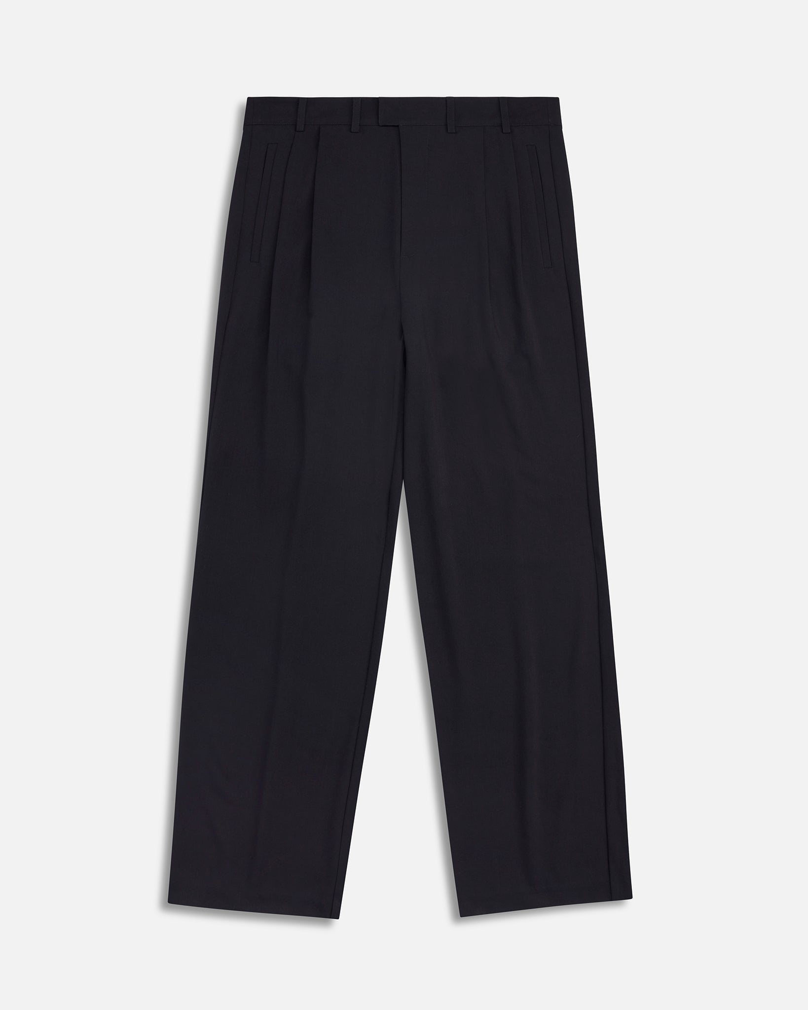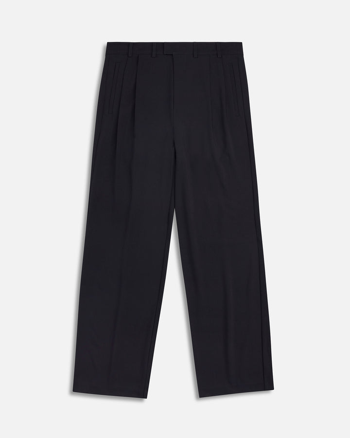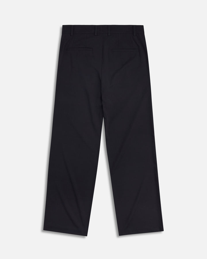 A modern essential, the Eco Wool Pleated Trouser in Dark Navy features a double-pleated front and relaxed wide-leg silhouette. Crafted from a midweight wool blend with stretch, it’s designed with a zip fly, hook-and-eye closure, and welt pockets at front and back for a tailored yet comfortable fit. Finished with belt loops and darts at the back for added structure.