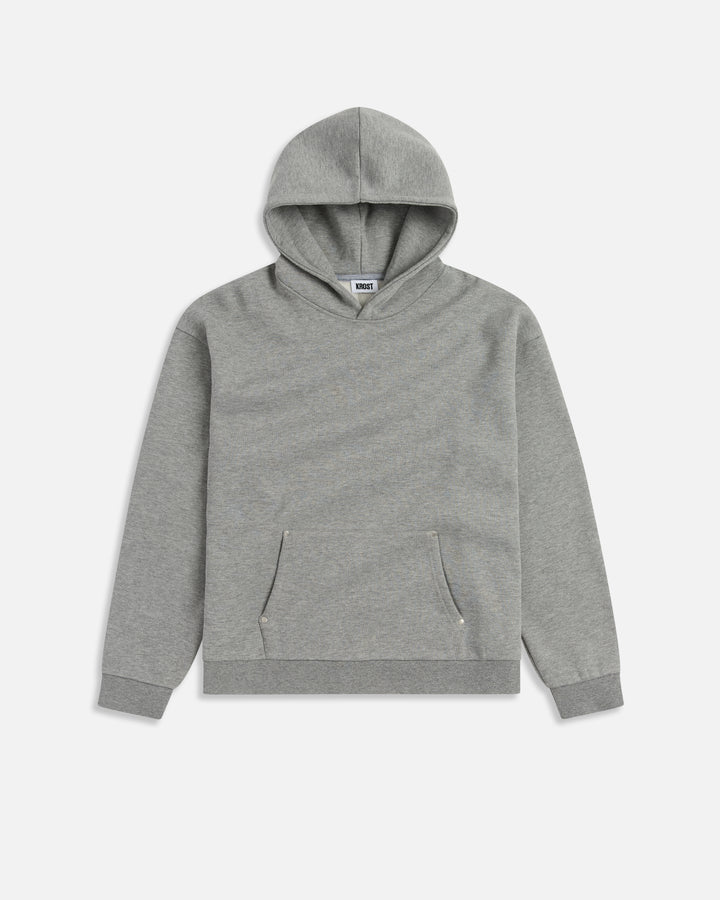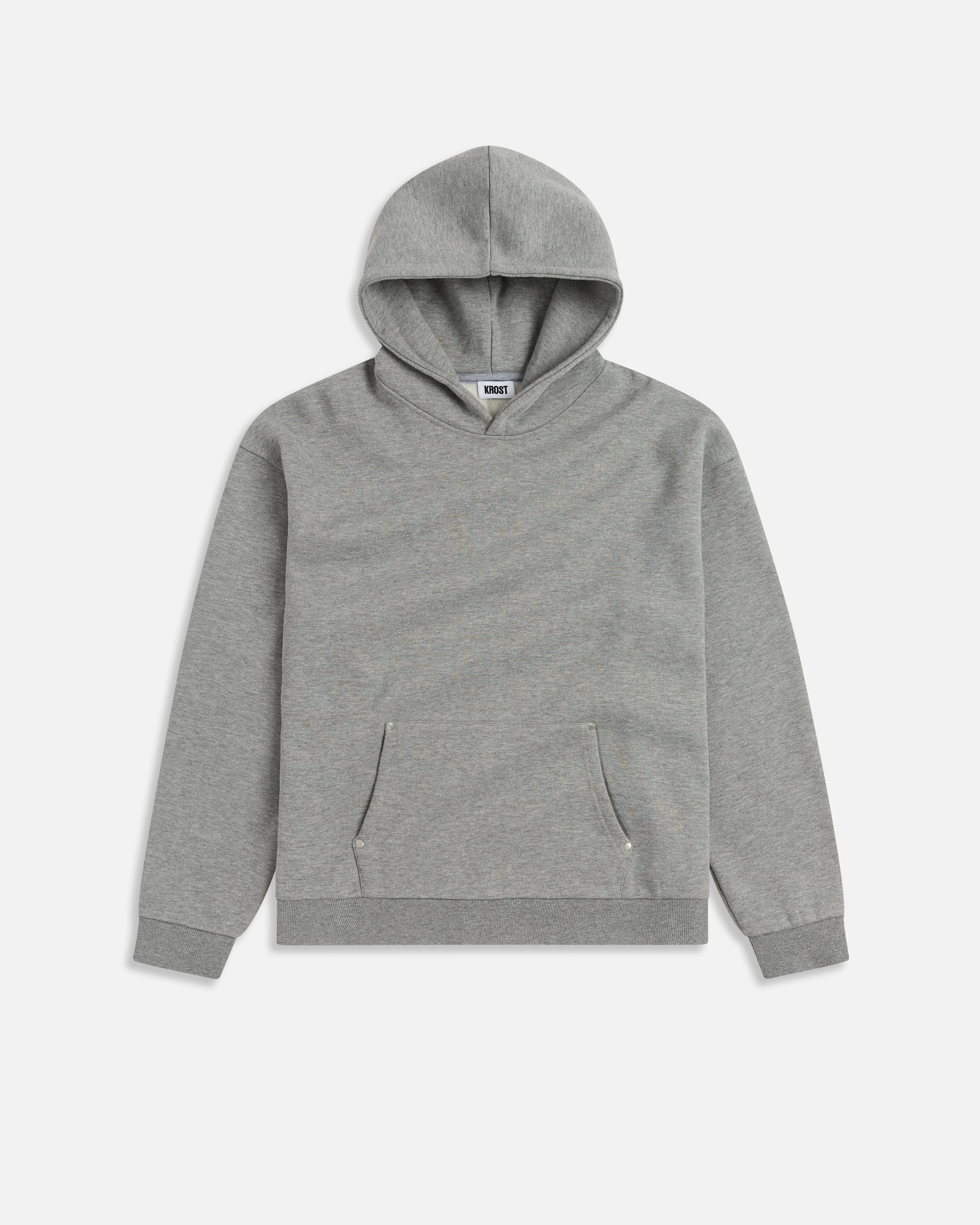 Made from soft brushed terry fabric, this hoodie combines comfort with a refined finish. It features a kangaroo pocket detailed with matte silver rivets, ribbed cuffs and hem for structure, and dropped shoulders for a relaxed fit. Finished with a subtle KROST flag label.