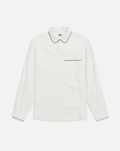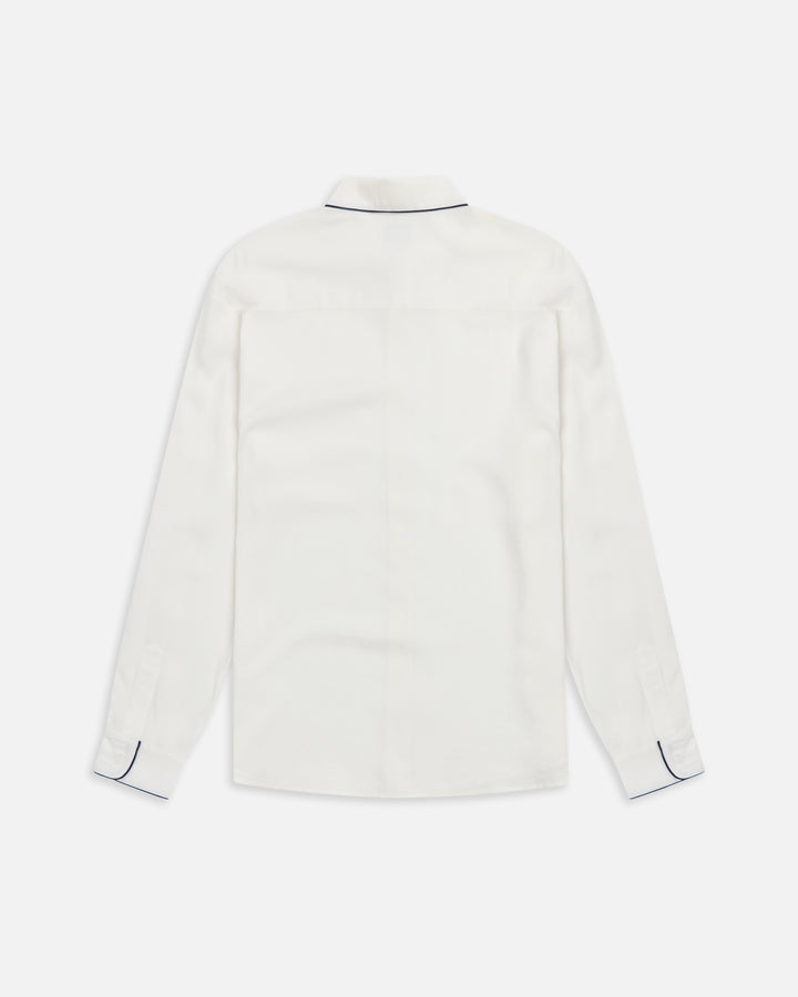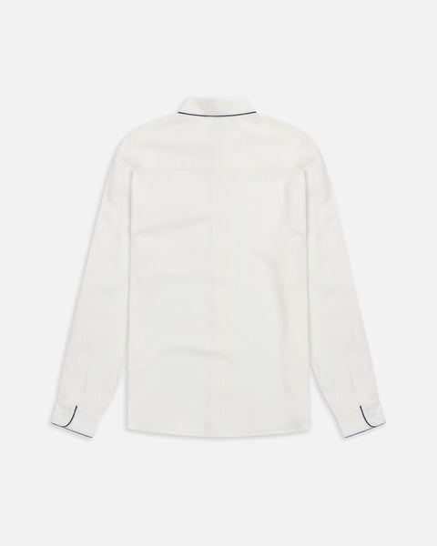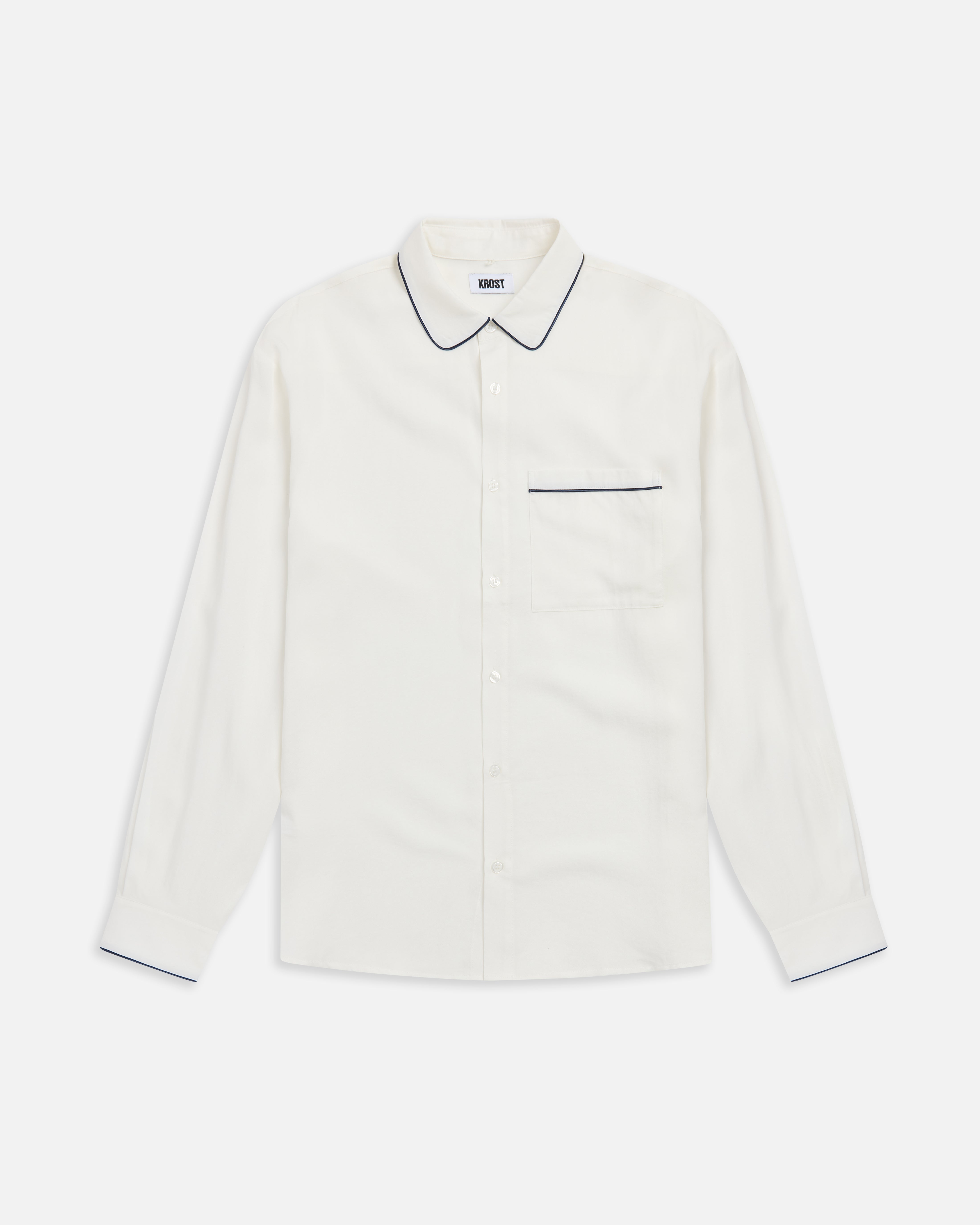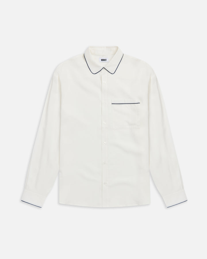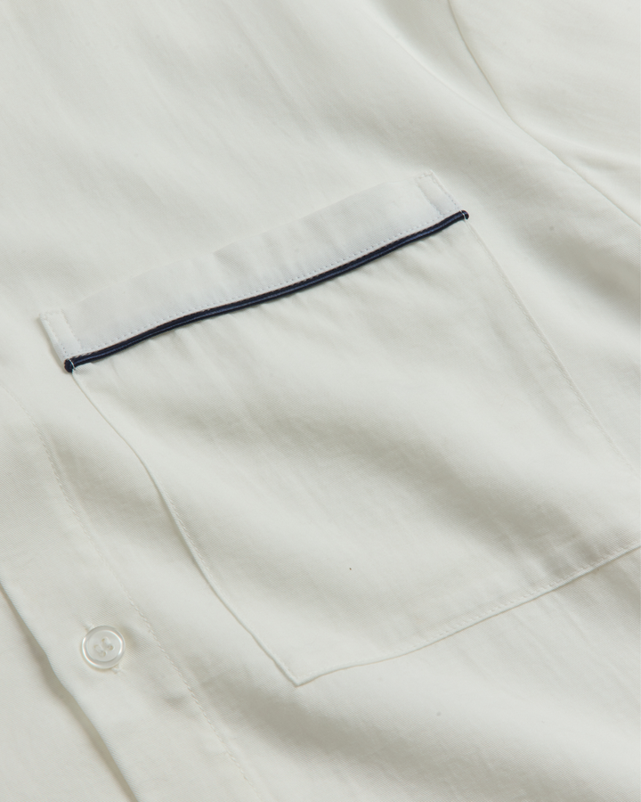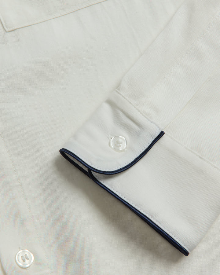 Crisp Tencel shirt featuring satin piping at the collar, cuffs, and chest pocket. Designed with a curved hem, pointed collar, and a clean, regular fit.