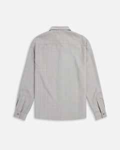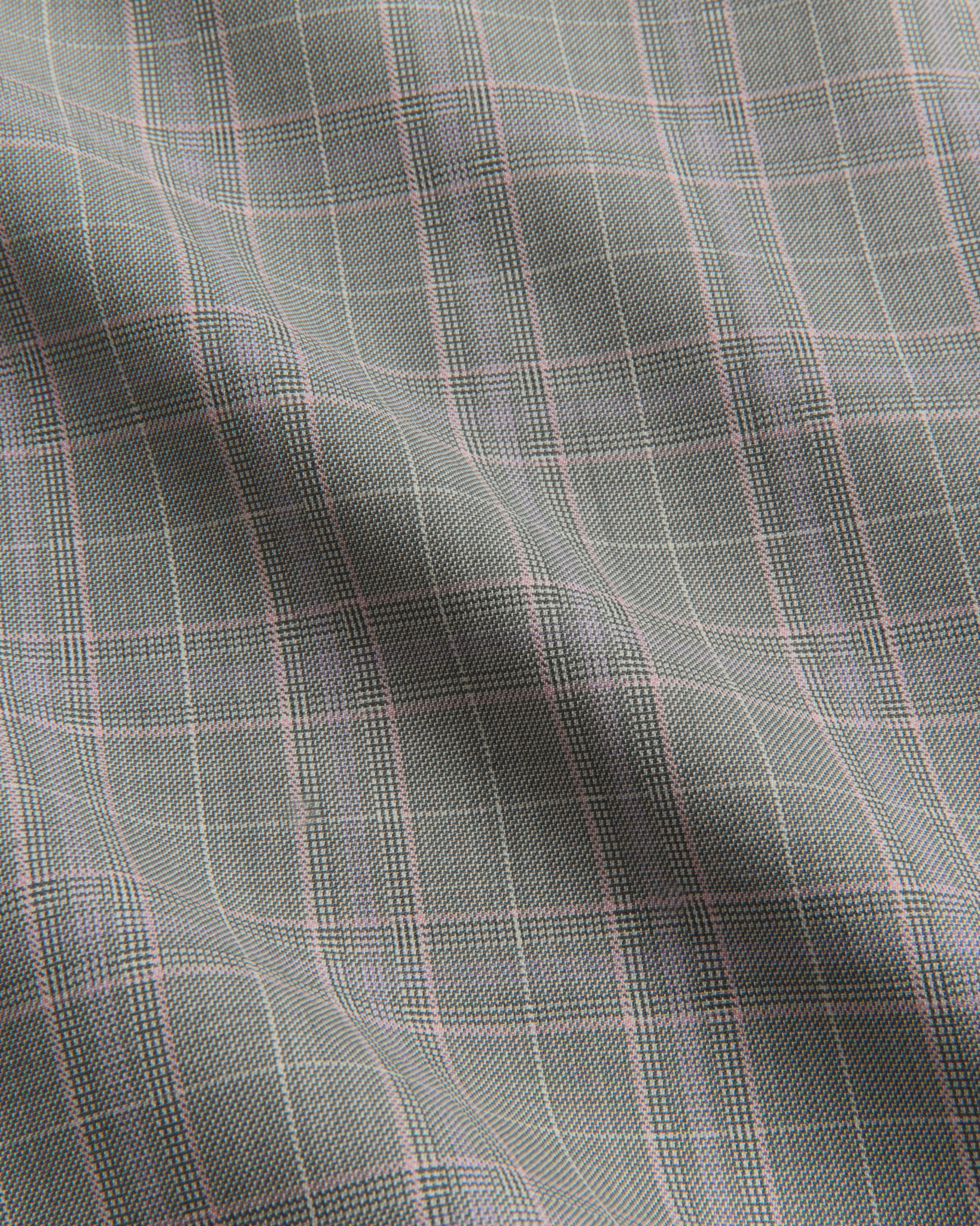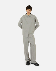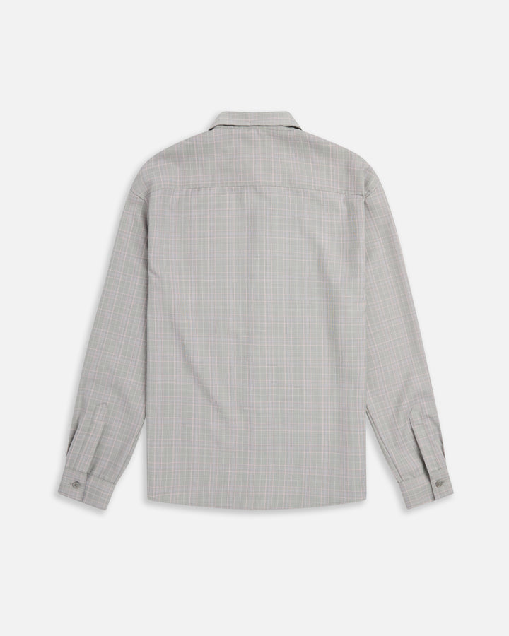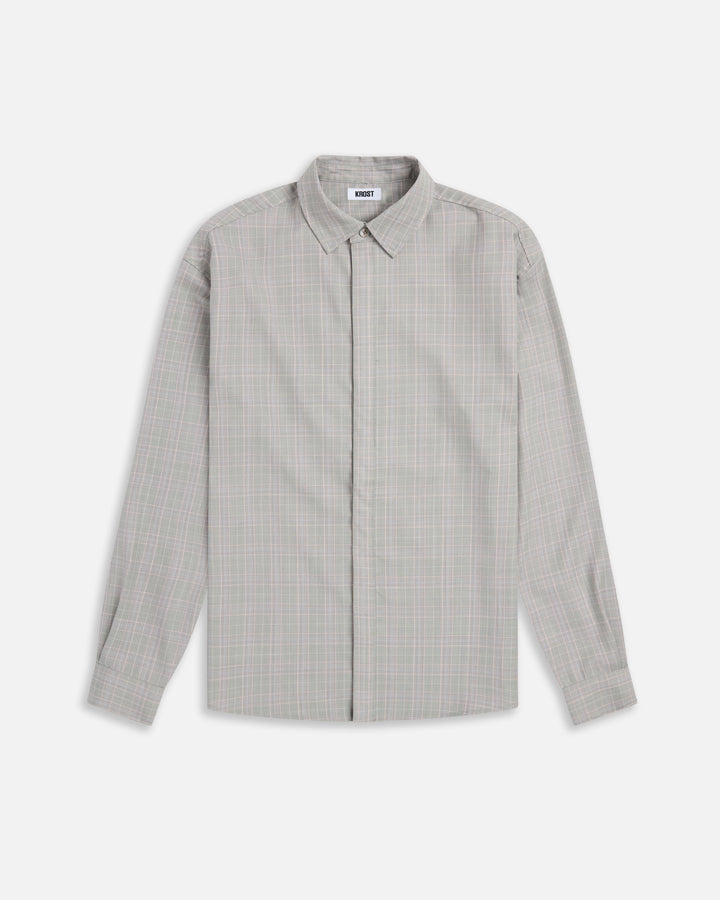 Tailored wool-blend shirt with a pointed collar, covered placket, curved hem, and back yoke. Lightweight structure makes it ideal for layering.