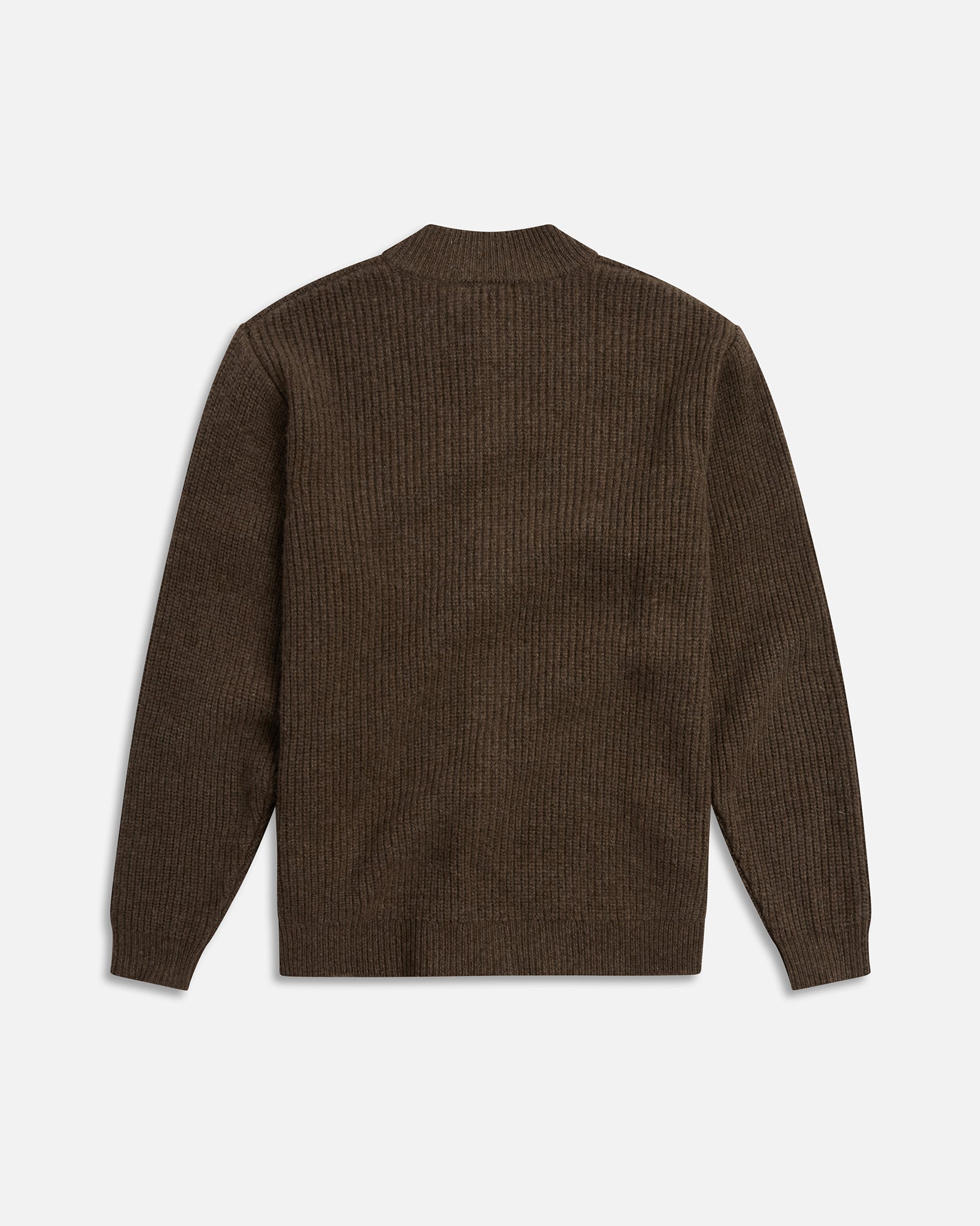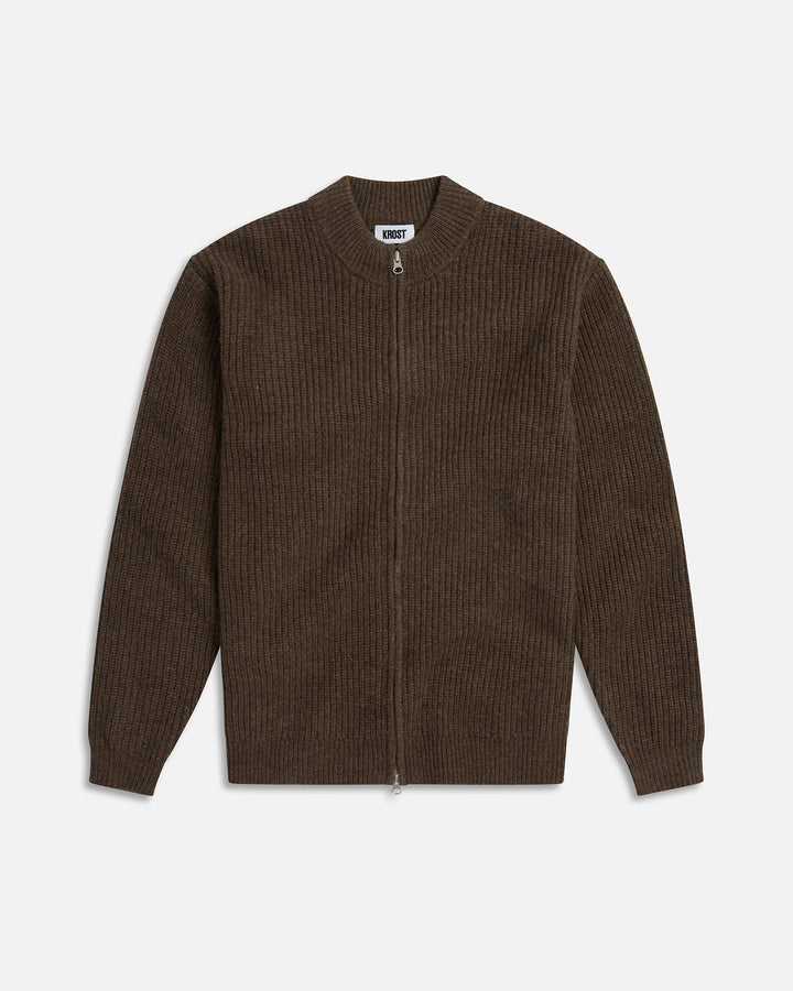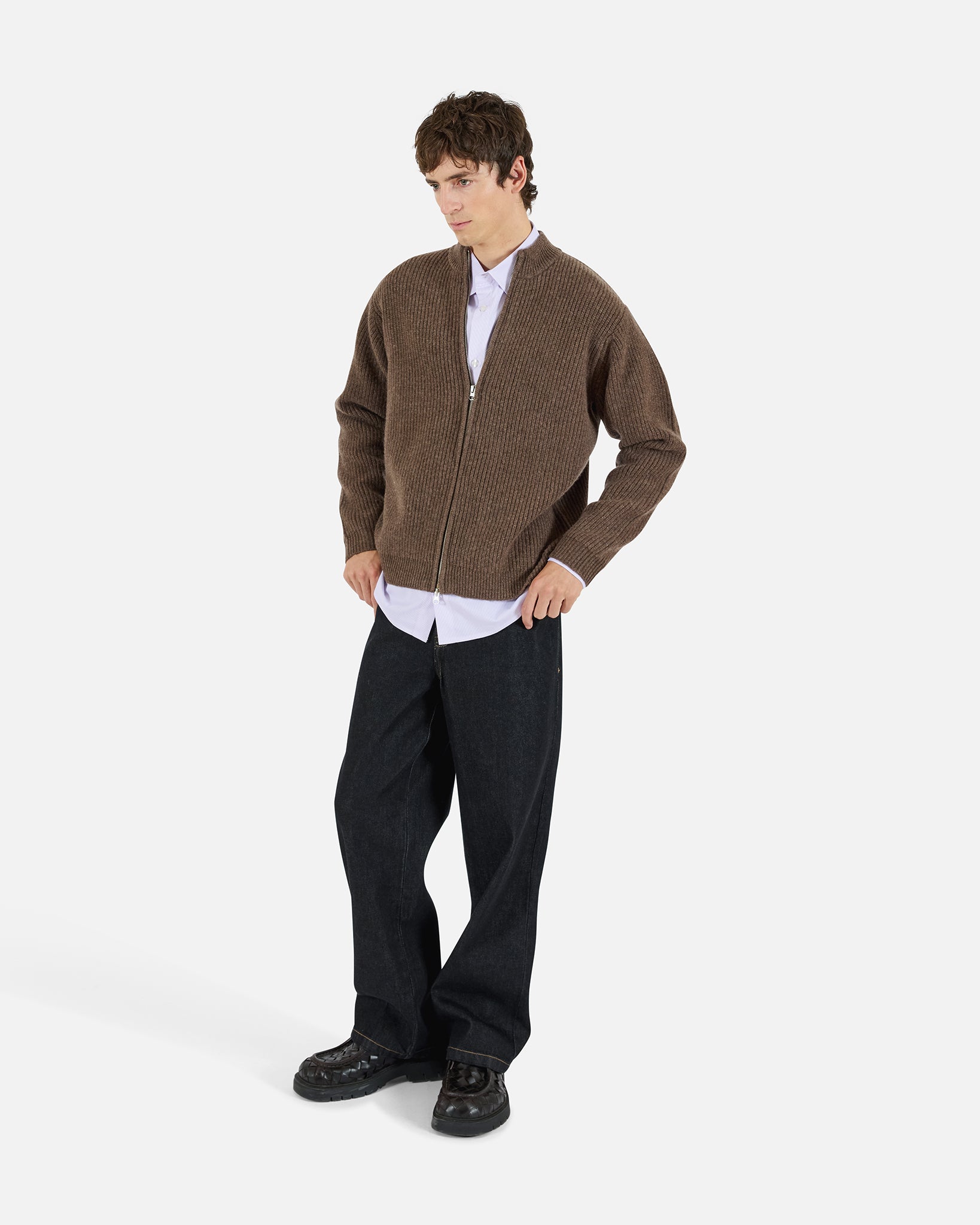 The Liv Wool Zip Cardigan in Espresso is crafted from heavyweight virgin wool with a full two-way zip and rib-knit detailing throughout. Designed with dropped shoulders and a slightly cropped fit, this cardigan balances warmth, structure, and soft texture.