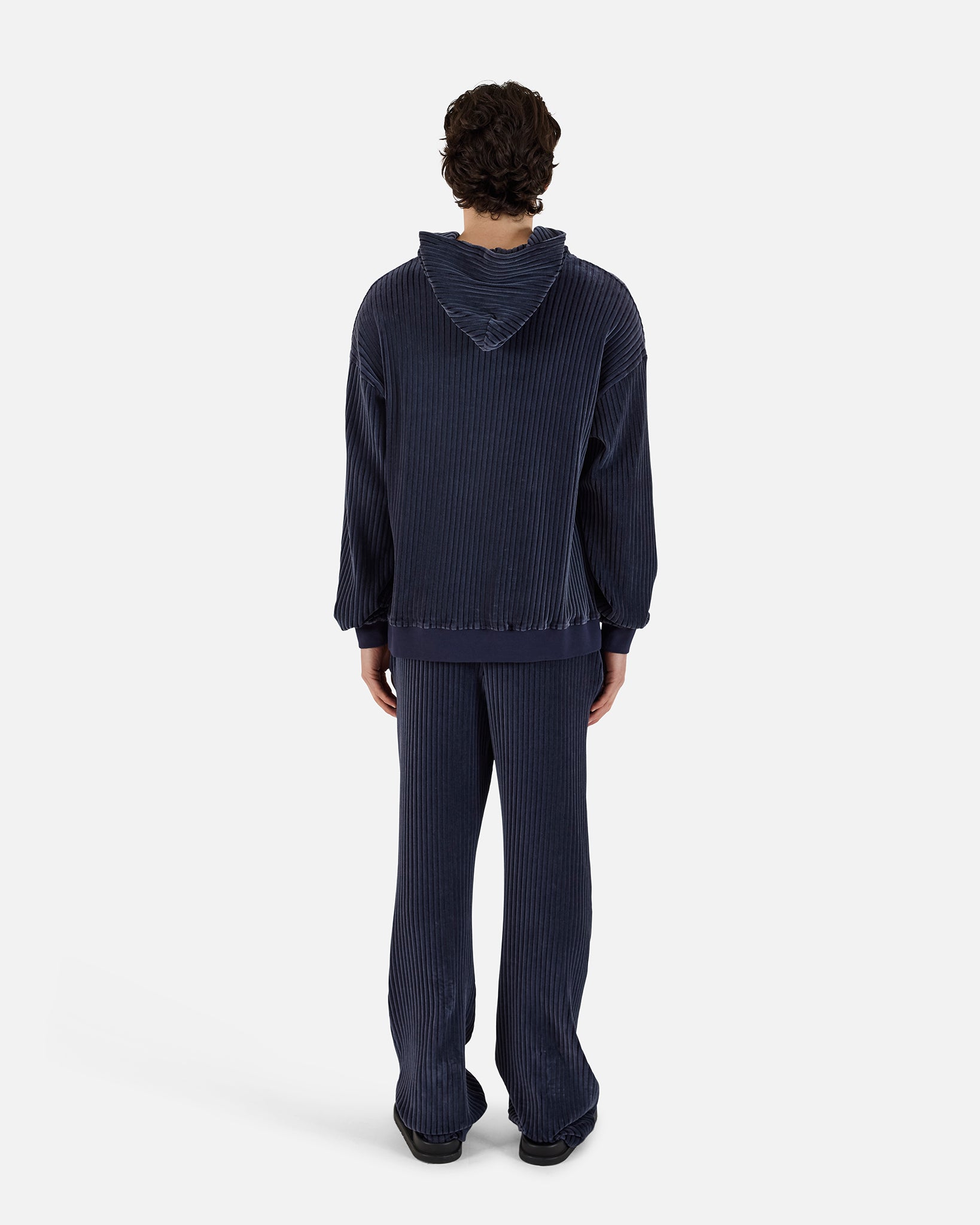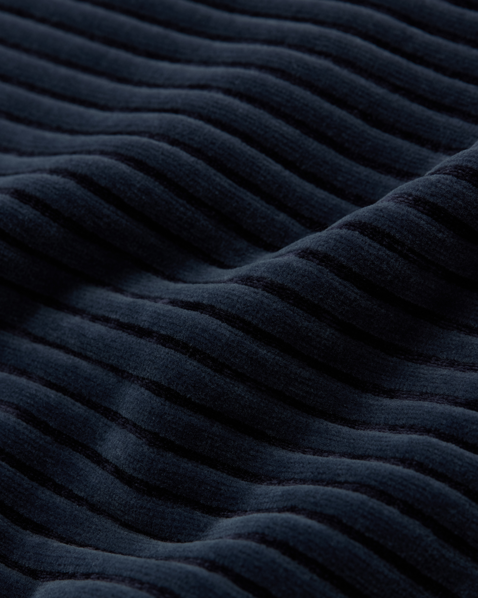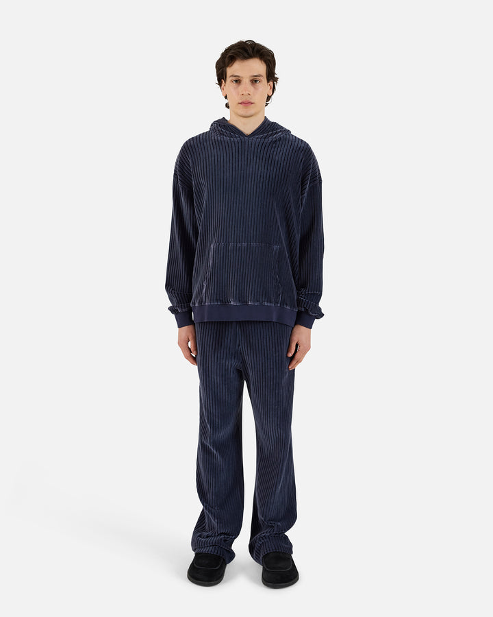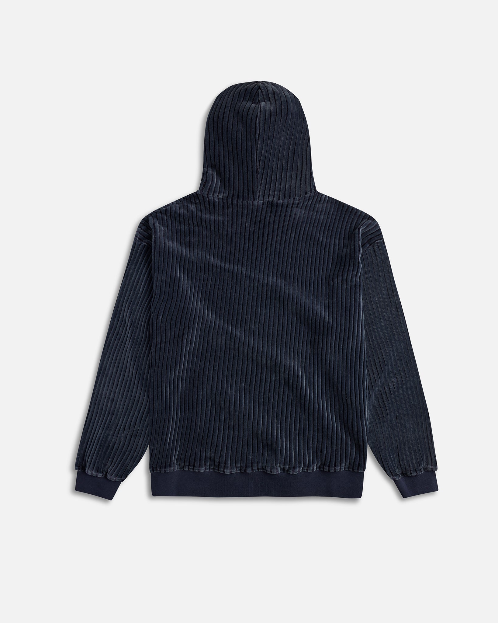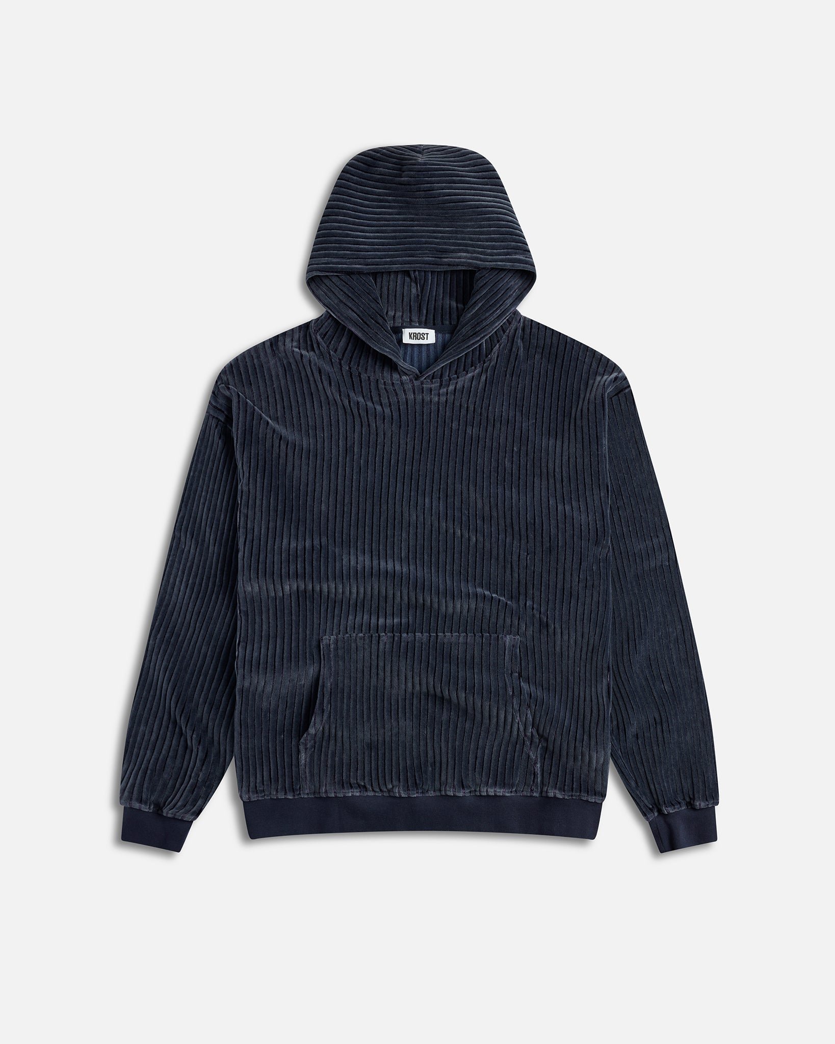 The Magma Velour Hoodie in Dark Navy brings elevated comfort to an everyday silhouette. Crafted in Portugal from a soft, drapey velour with vertical rib, it features a kangaroo pocket and a regular fit. Finished with flag label at the side seam for a clean, minimal look.