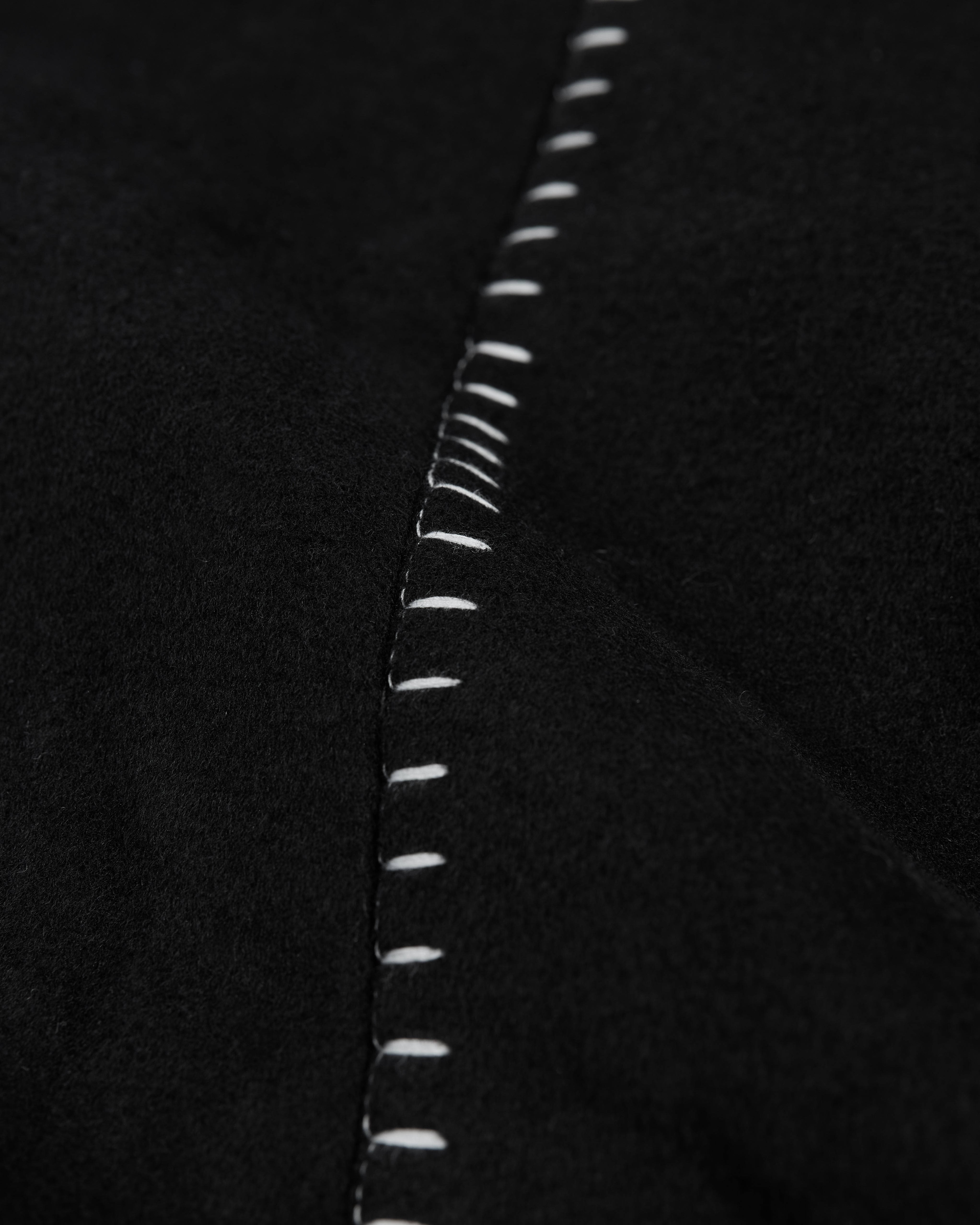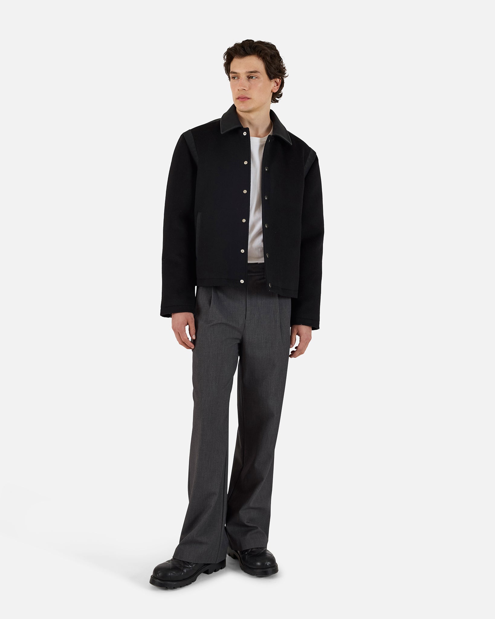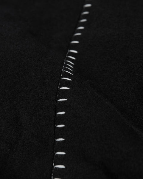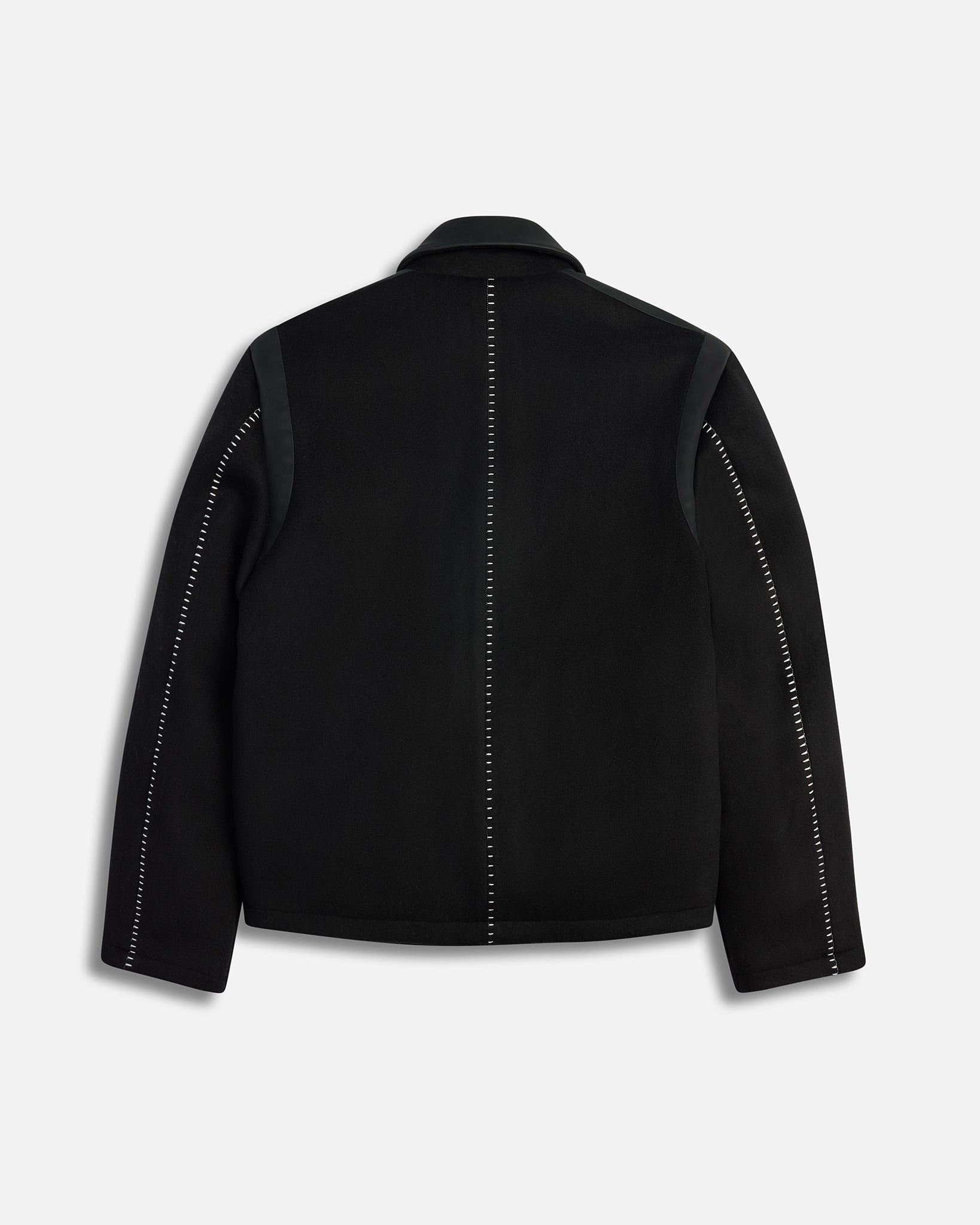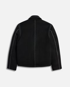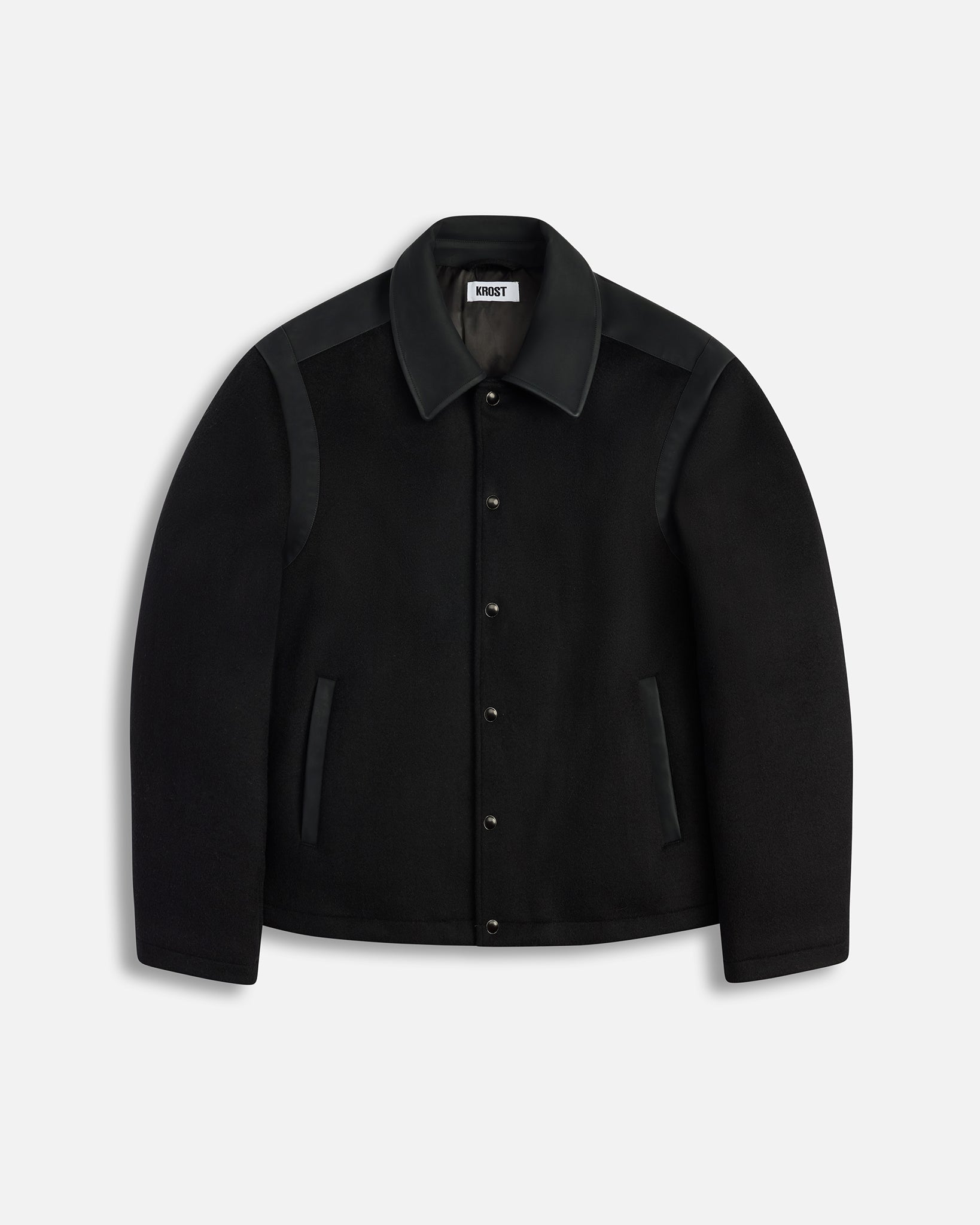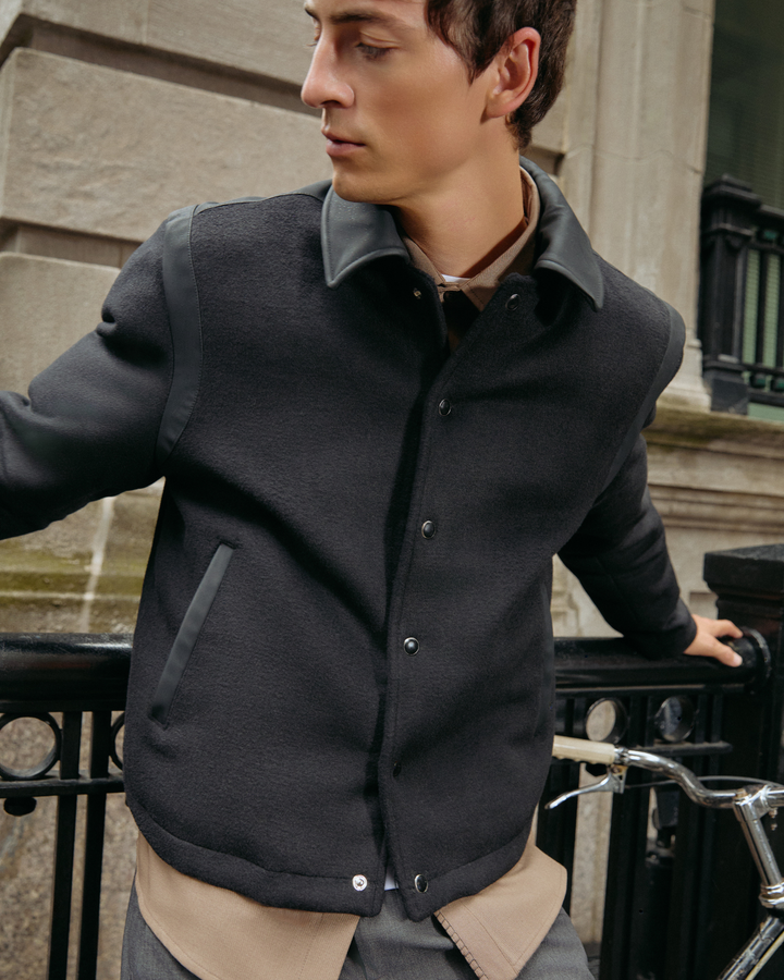 A refined update to a classic staple. The Mercer Varsity Jacket in Black features a wool-blend body with faux leather panels at the collar, shoulders, and welt pockets. Contrast blanket stitching adds a subtle statement to the sleeves and center back seam, while snap button closures and insulated ribbed cuffs offer both function and style. Fully lined with an interior zip pocket for added utility.
