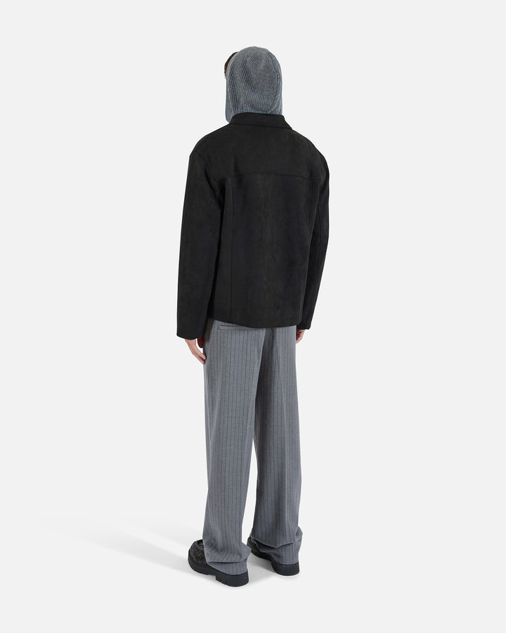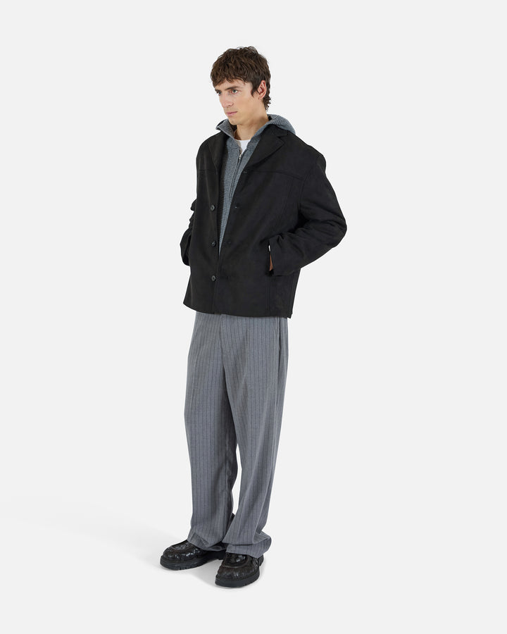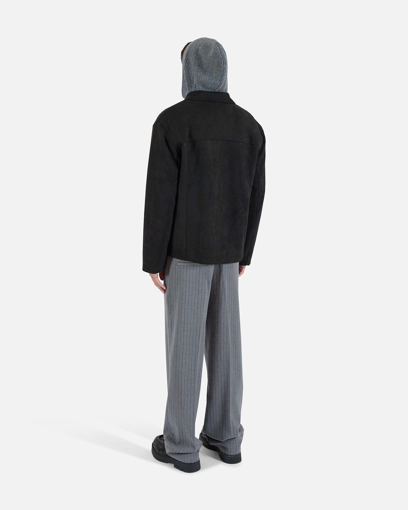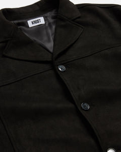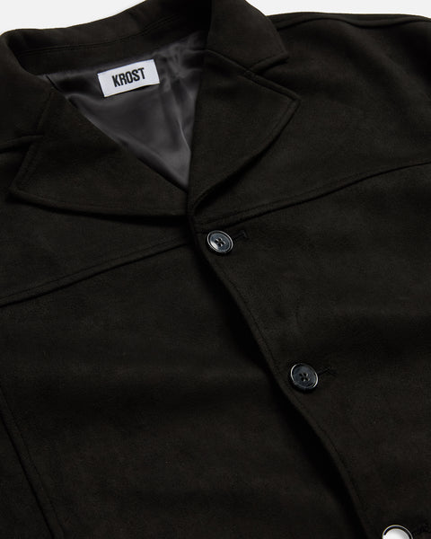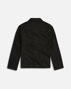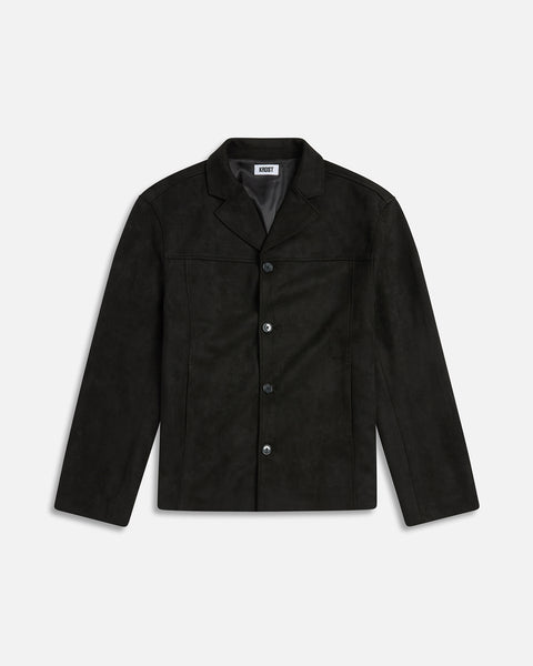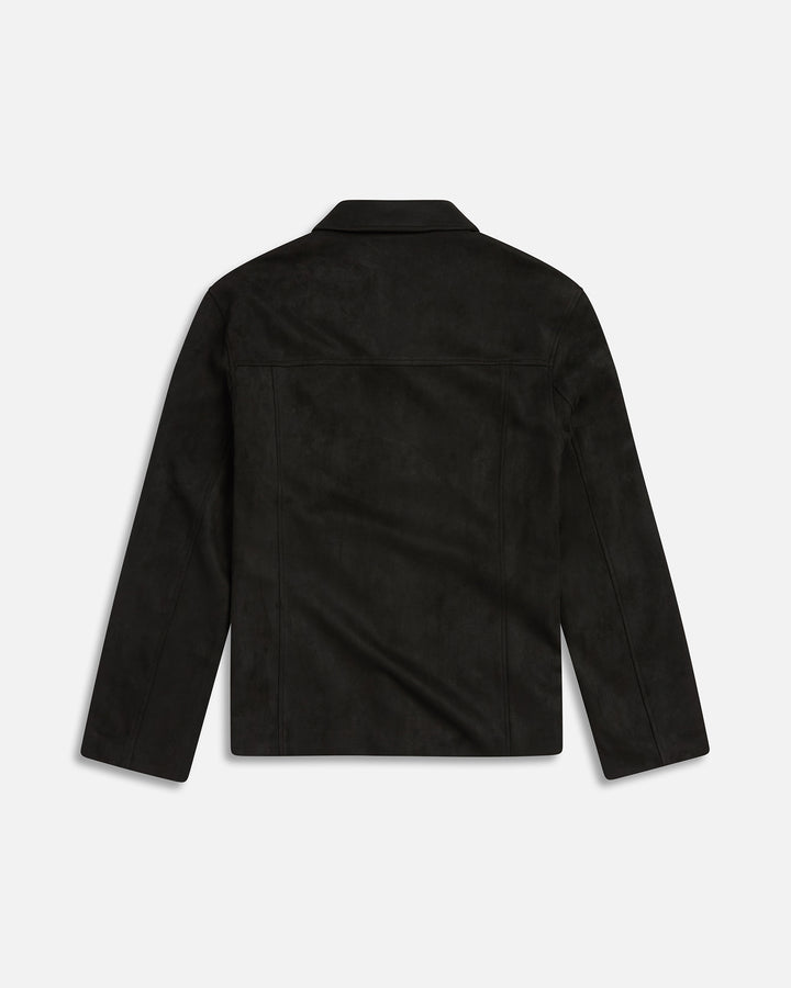 A refined take on a transitional staple, the Suede Lapel Jacket in black features a notched lapel, four-button front closure, and discreet seamed pockets. Fully lined for added comfort, the soft faux suede texture elevates the everyday jacket with a tailored edge.