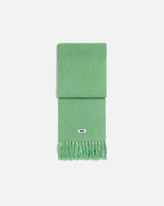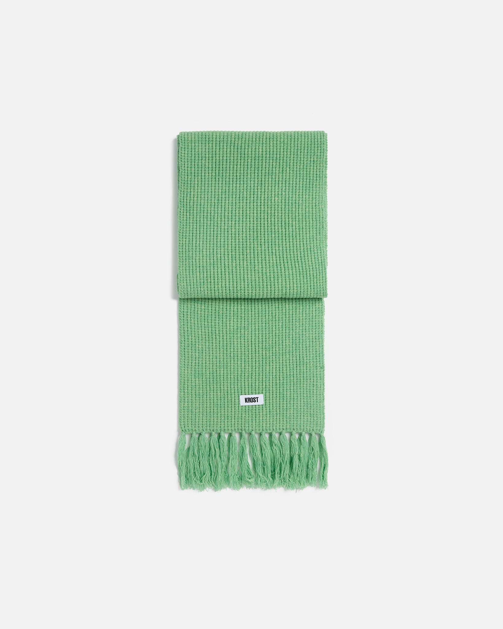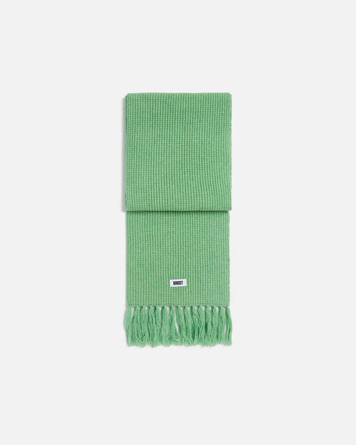 The Wool Speckle Scarf in Kelly Green is crafted in a heavyweight wool yarn with subtle flecked texture. Its extra-long silhouette and fringe ends allow for versatile styling, while a woven KROST label completes the look.